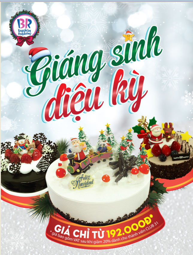 Cảm giác lành lạnh được ngồi ăn kem và hít hà thật là tuyệt đúng không các bạn? Giáng sinh năm nay, Baskin Robbins mang cả khu rừng tuyết vào nhà bạn với những mẫu thiết kế rực rỡ trên nền kem trắng xóa kết hợp tinh tế với các mùi kem hảo hạng được yêu thích trên thế giới. Với mức giá ưu đãi đặc biệt từ 192.000 đồng dành cho chủ thẻ thành viên CLUB 31 là bạn đã sở hữu ngay chiếc bánh Giáng Sinh.