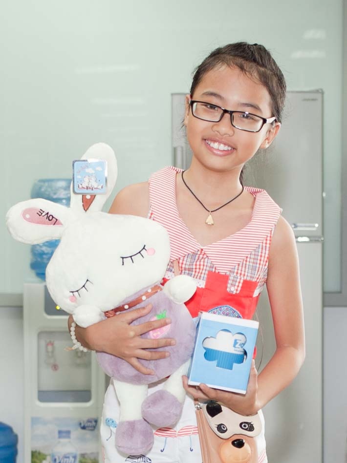 | Phương Mỹ Chi nhí nhảnh với món quà vừa nhận được. Cô bé 10 tuổi đang sẵn sàng trả lời tất cả các câu hỏi từ độc giả. |