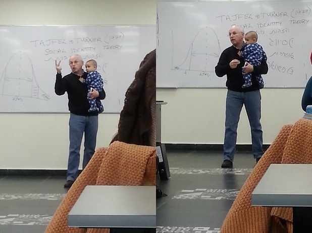 | Vị giáo sư vừa bế con sinh viên, vừa giảng bài. Ảnh: Buzzfeed. |
