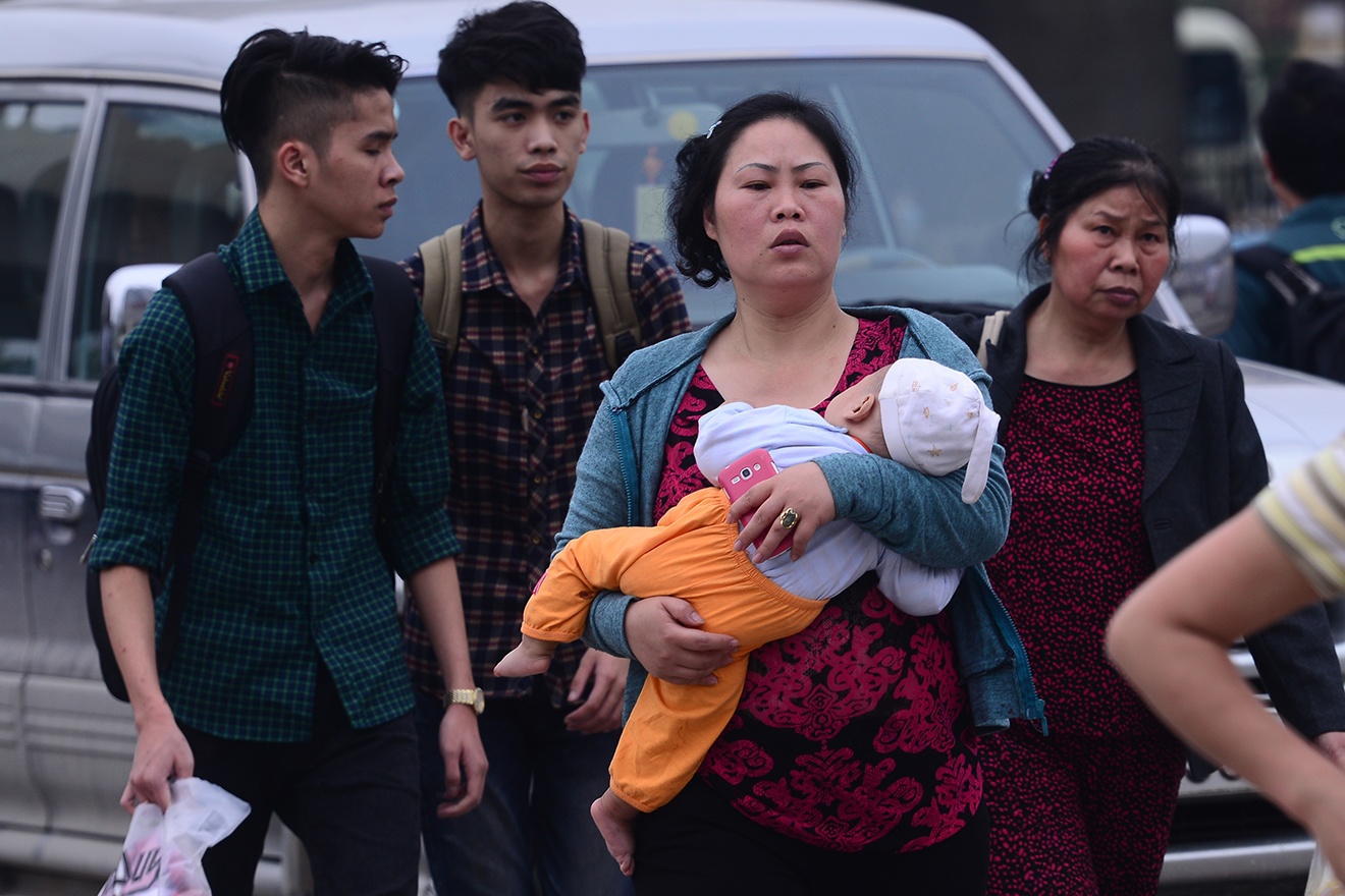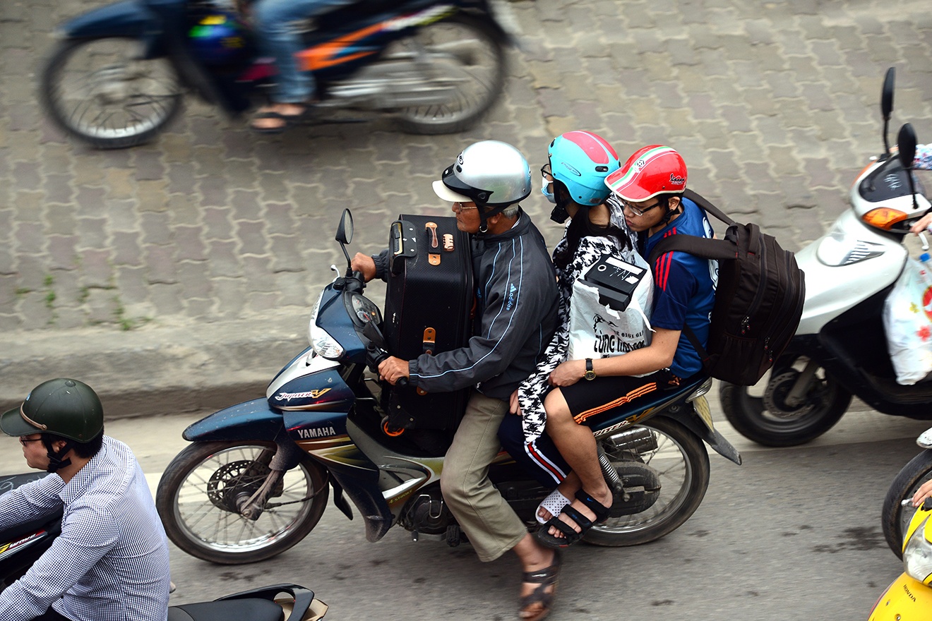 | Nhiều gia đình chọn giải pháp đi xe máy chở con cái về quê và phải bon chen giữa chốn đông người. |