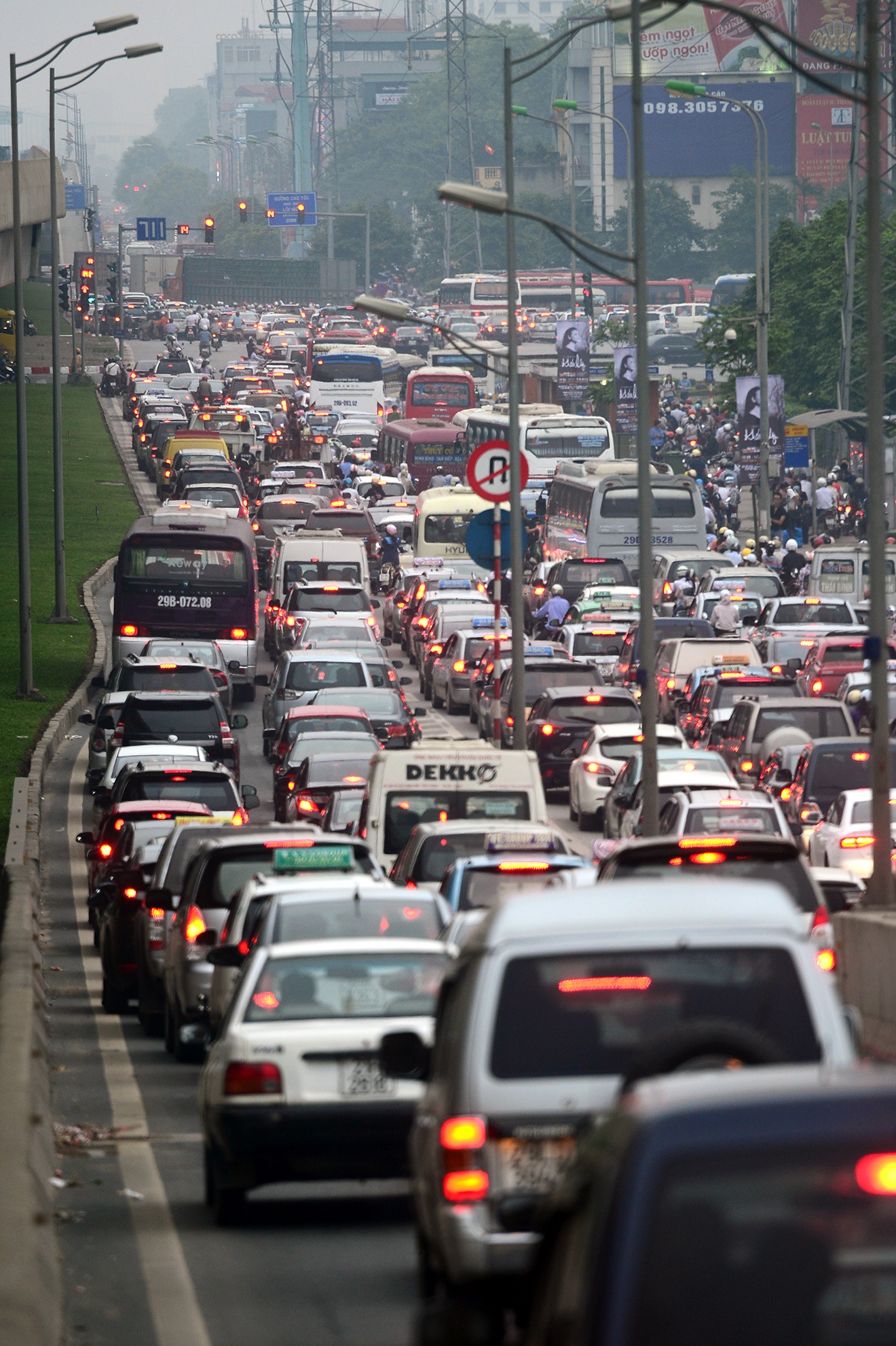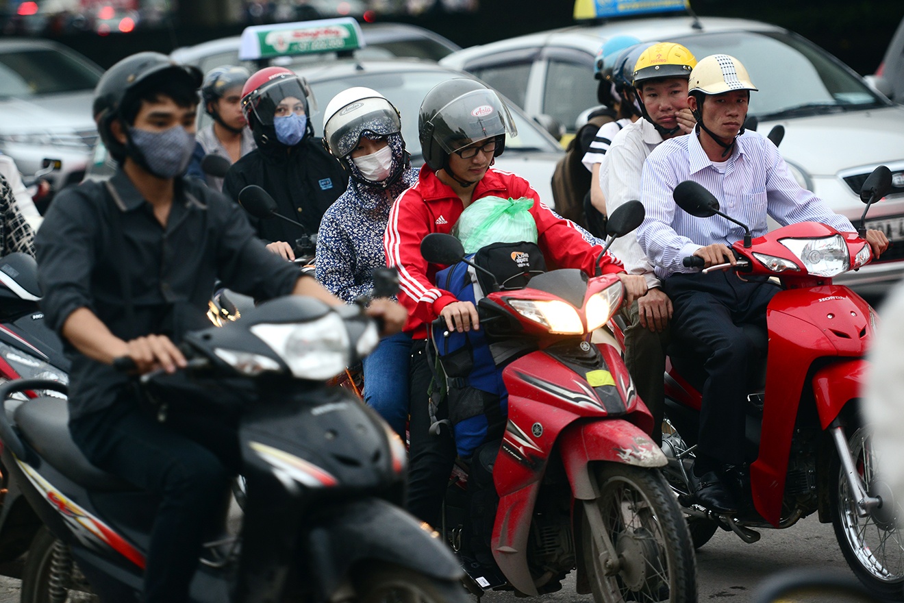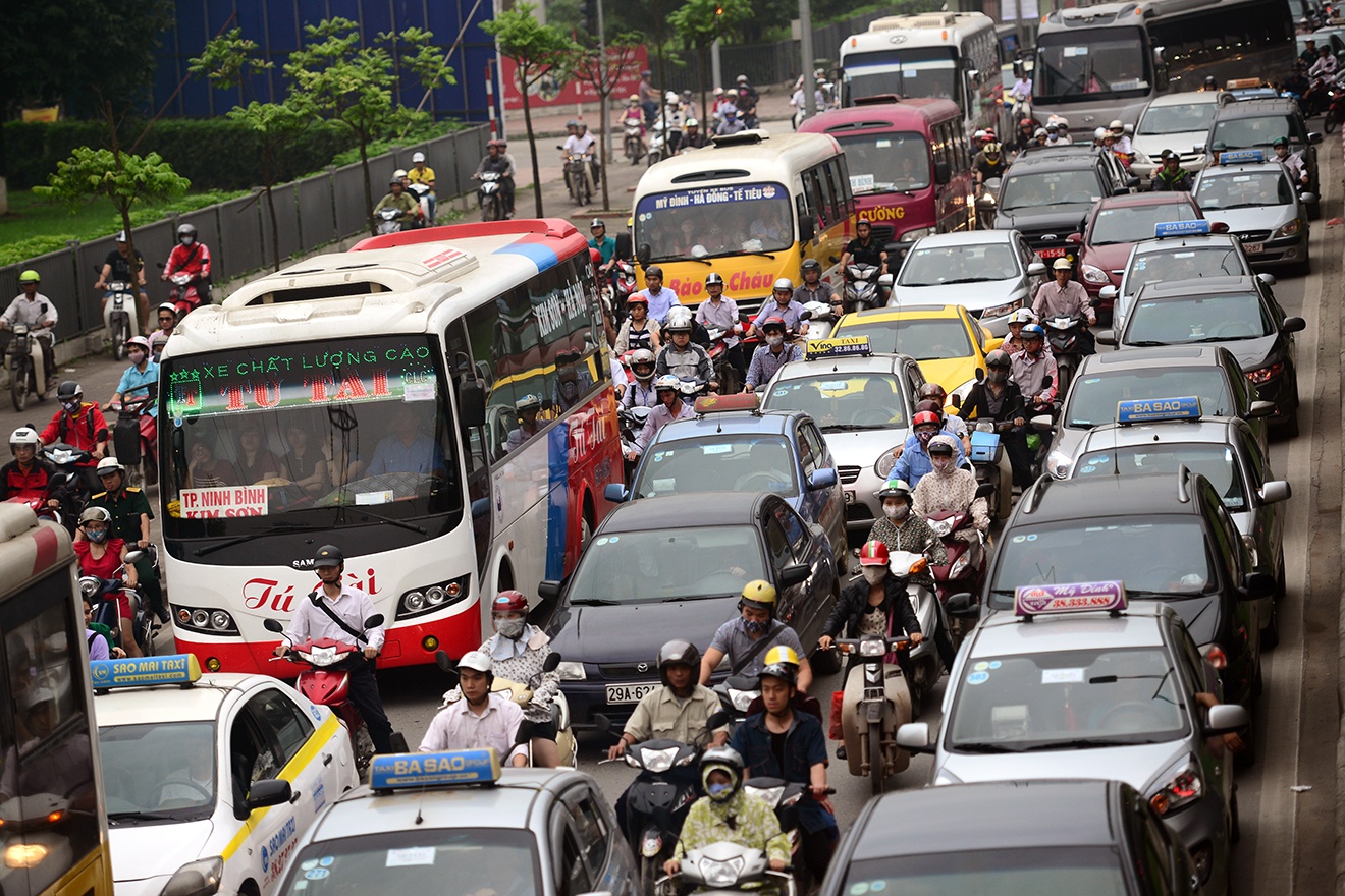 | Suốt chiều dài tuyến đường bị tắc nghẽn, không chỉ có xe khách đưa người dân ra khỏi thành phố, hàng trăm ô tô con cũng xuất hiện, dàn hàng năm hàng bảy chiếm hết lối đi của xe máy, xe đạp. |