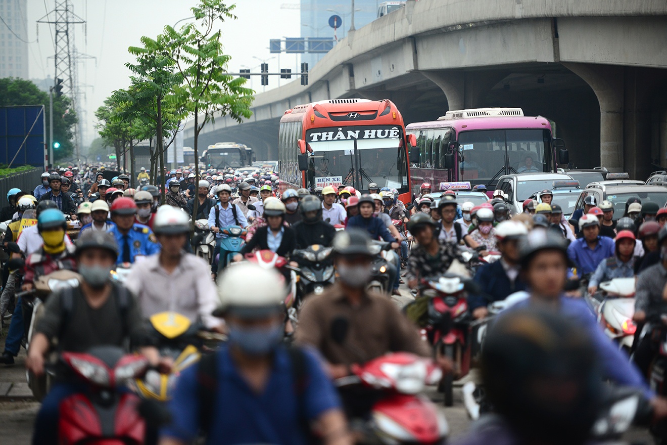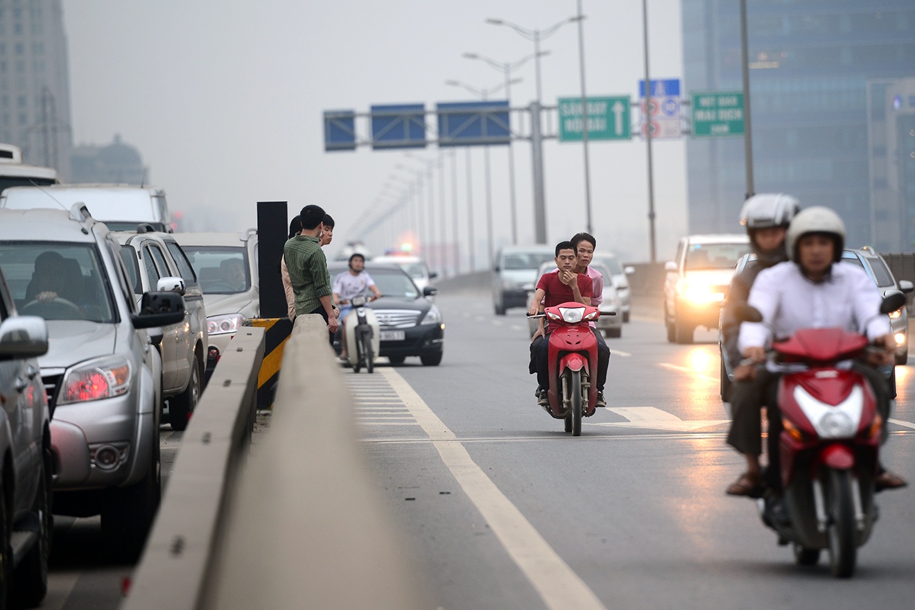 | Nhiều xe máy đi cả lên đường trên cao vành đai 3, nơi chỉ dành cho ô tô. Cho đến 19h tối 29/4, nhiều nơi vẫn tắc nghẽn. |