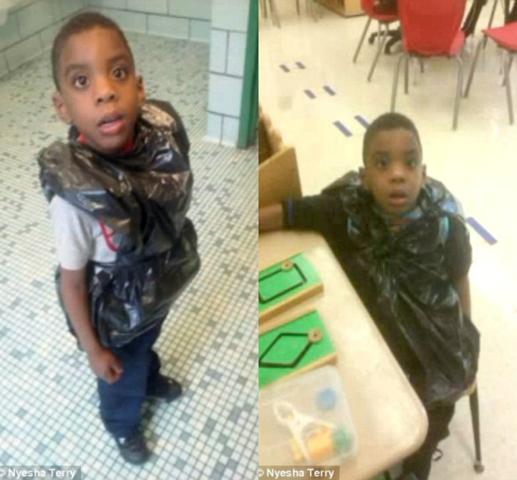 Nyesha Terry (ở thành phố Chicago, Mỹ) rất sốc khi nhìn thấy con trai, Lloyd Terry, bị quấn trong túi rác ở trường học.