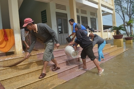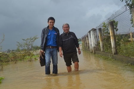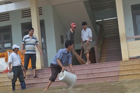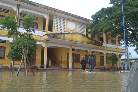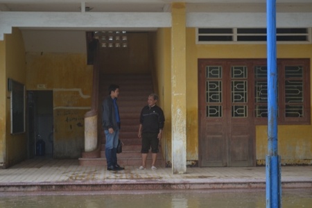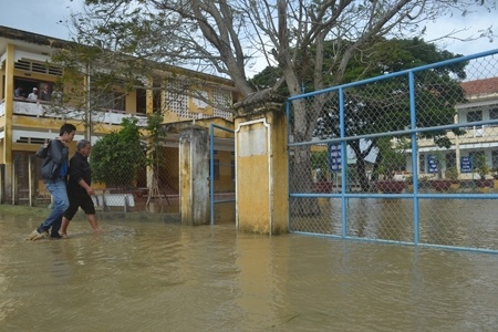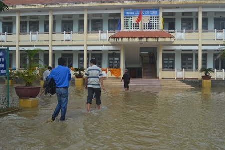 | Giáo viên Cát Chánh cơ cực lội lũ giữa sân trường. |