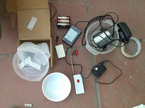Qua kiểm tra, tổ công tác phát hiện trong cốp xe máy có 1 bộ đồ cờ bạc bịp gồm bát sứ gắn camera, màn hình LCD, bộ điều khiển từ xa,...
