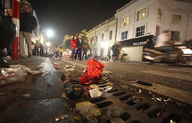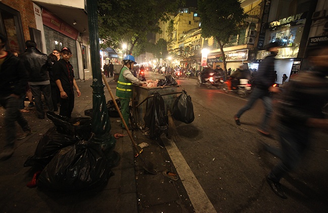 | Rác cả ngoài đường lẫn từ trong nhà hàng chất đống đầy vỉa hè. Người công nhân quét rác lại phải làm việc mệt nghỉ. |