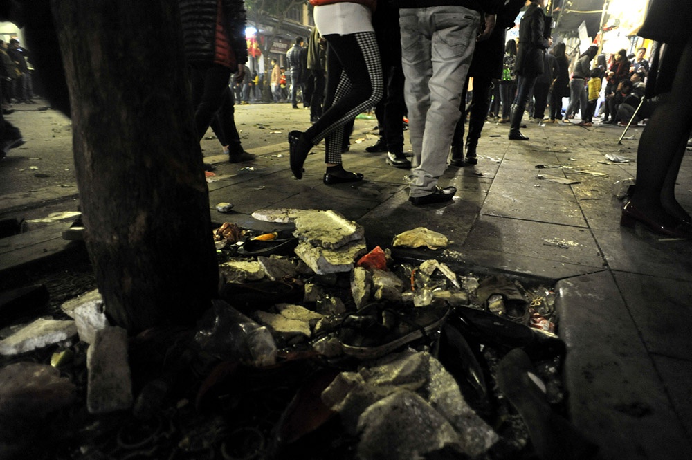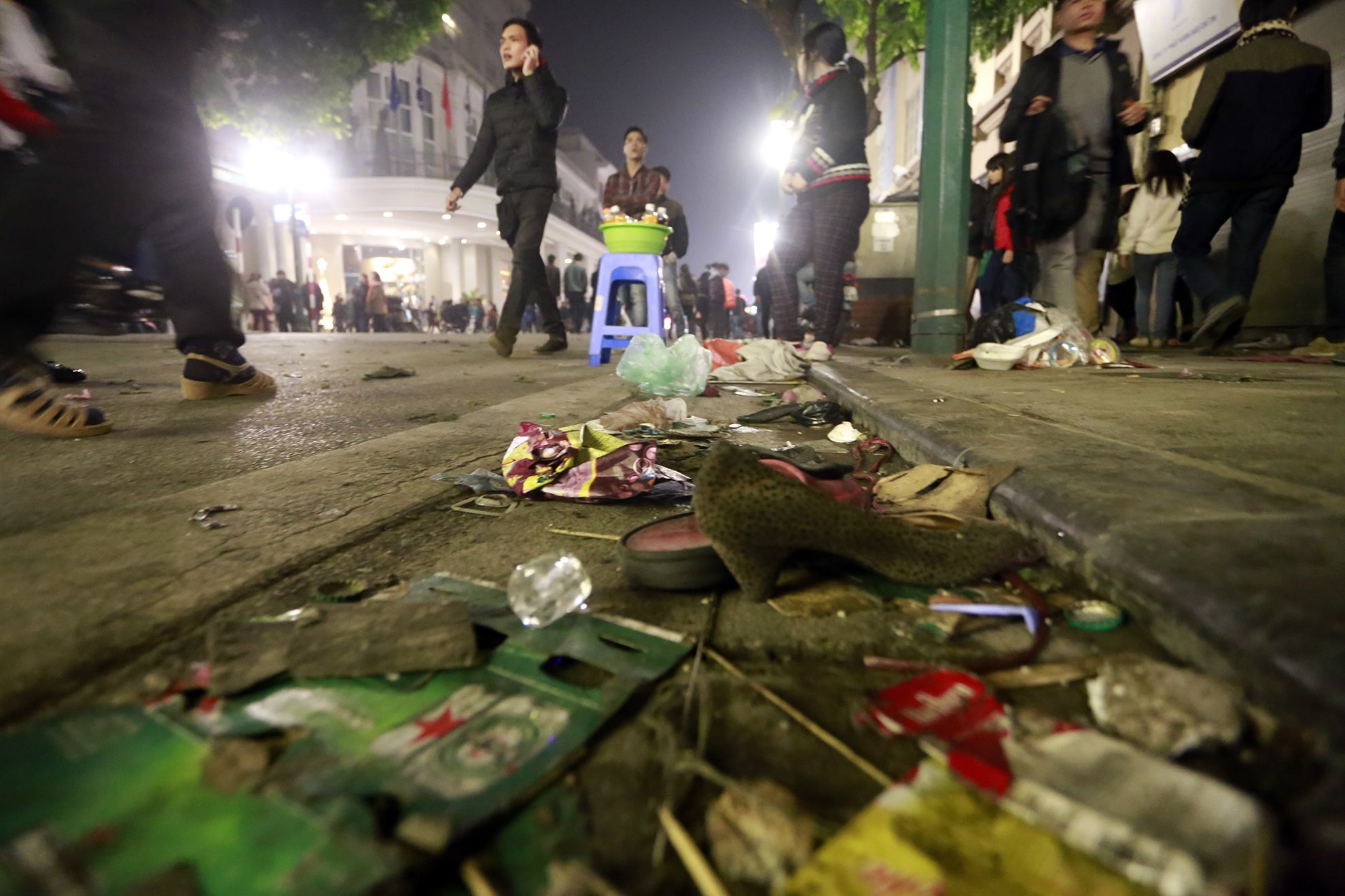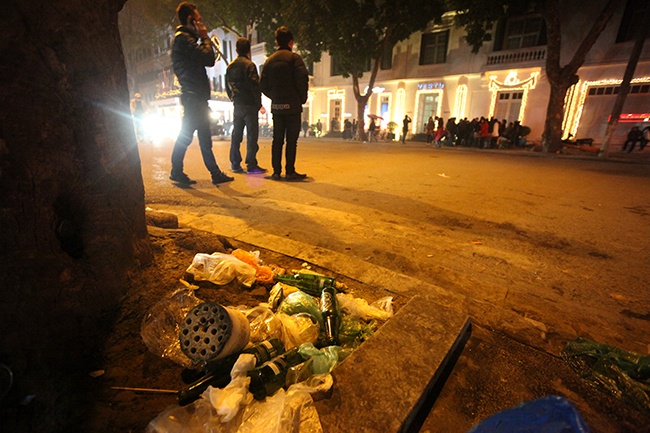 | Gốc cây xà cừ trên phố Ngô Quyền với nhiều vỏ chai bia vứt lăn lóc. Hậu quả từ một nhà tài trợ bia mang đến lễ hội đếm ngược. Ảnh: Hoàng Thành. |