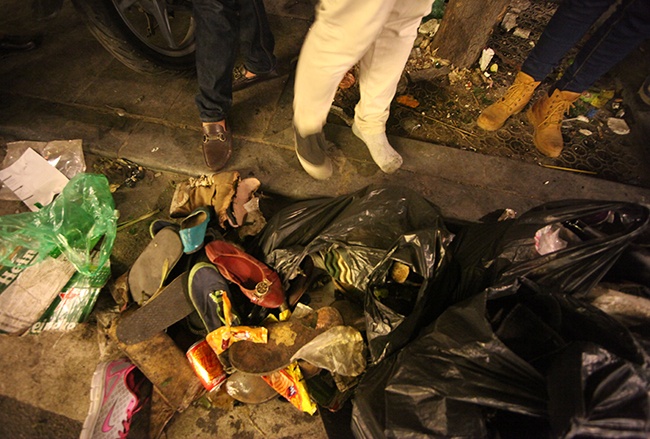 | Đặc biệt, rất nhiều giầy dép bị mất chủ sau hậu quả của những pha chen lấn xô đẩy. Ảnh: Lê Hiếu. |