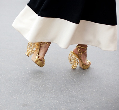 | Giày ánh kim + váy xòe = Cô nàng lãng mạn. |