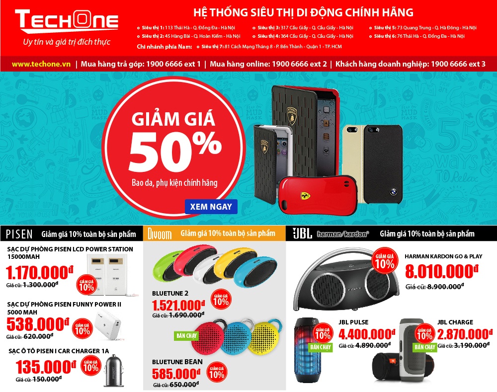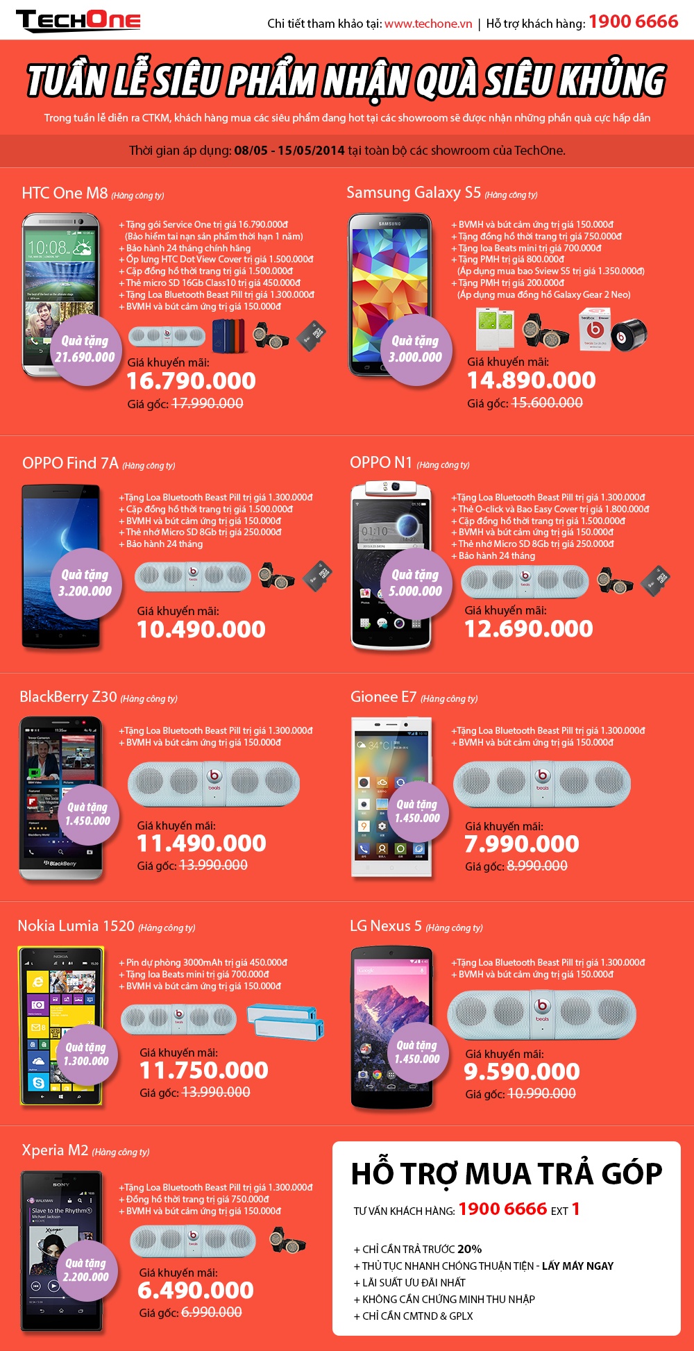 Nằm trong chuỗi chương trình Tri ân khách hàng tháng 5 TechOne gửi tới khách hàng chương trình Tuần lễ siêu phẩm - Quà nhận siêu khủng áp dụng cho rất nhiều sản phẩm của các thương hiệu nổi tiếng như HTC, NOKIA, Blackberry, SONY, OPPO, LG, SamSung…, giảm giá lên tới 30% cùng với khuyến mại lến đến 20 triệu đồng.