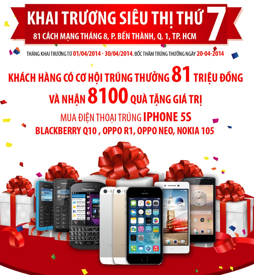 Hệ thống siêu thị di động TechOne một trong những đại lý phân phối của các dòng sản phẩm Apple, OPPO, Nokia, SamSung, HTC, SONY, Lenovo, cam kết cung cấp tới tay người dùng những sản phẩm chất lượng nhất, giá rẻ nhất, dịch vụ hoản hảo nhất. Hệ thống siêu thị di động chính hãng TechOne triển khai chương trình mừng khai trương siêu thị thứ 7 tại địa chỉ: 81 CMT8, quận 1, TP.HCM, với rất nhiều ưu đãi, giảm giá lớn, tặng iPhone 5S, điện thoại OPPO, Blackberry Q10...