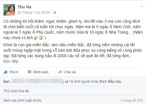 Mình là con gái miền Bắc, làm dâu miền Bắc, đã nếm những cái Tết suốt ngày ngập mặt trong cỗ bàn, bát đũa, phục vụ cúng kiếng rất phức tạp. Từng vác bụng bầu đi 2.000 cây số về quê ăn Tết, đứng nấu ăn và ngồi rửa chén gần như từ sáng tới tối…”.