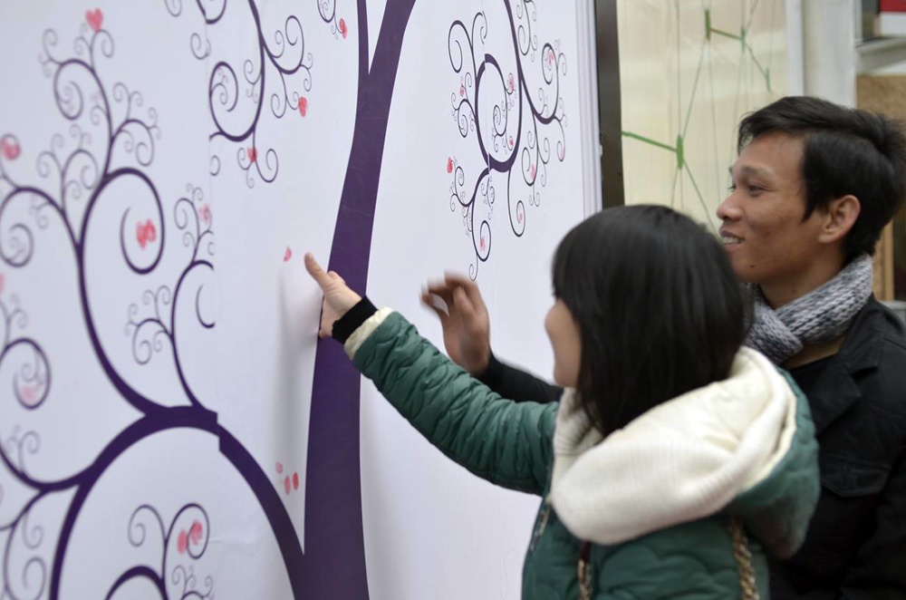 | Hầu hết các cặp tình nhân đều ghé qua cây tình yêu để ghi lại dấu vân tay kỷ niệm một Valentine ngọt ngào. |