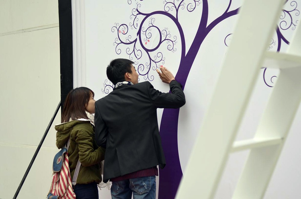 | Hôm qua (14/2), tại Hà Nội, hơn 2000 bạn trẻ đến tham dự sự kiện Moments of Love nhân ngày lễ Valentine. Sự kiện gây sốt bởi xuất hiện cây tình yêu cao 2.5m, tán rộng 3m được tạo bằng dấu vân tay hình trái tim của các cặp đôi. |