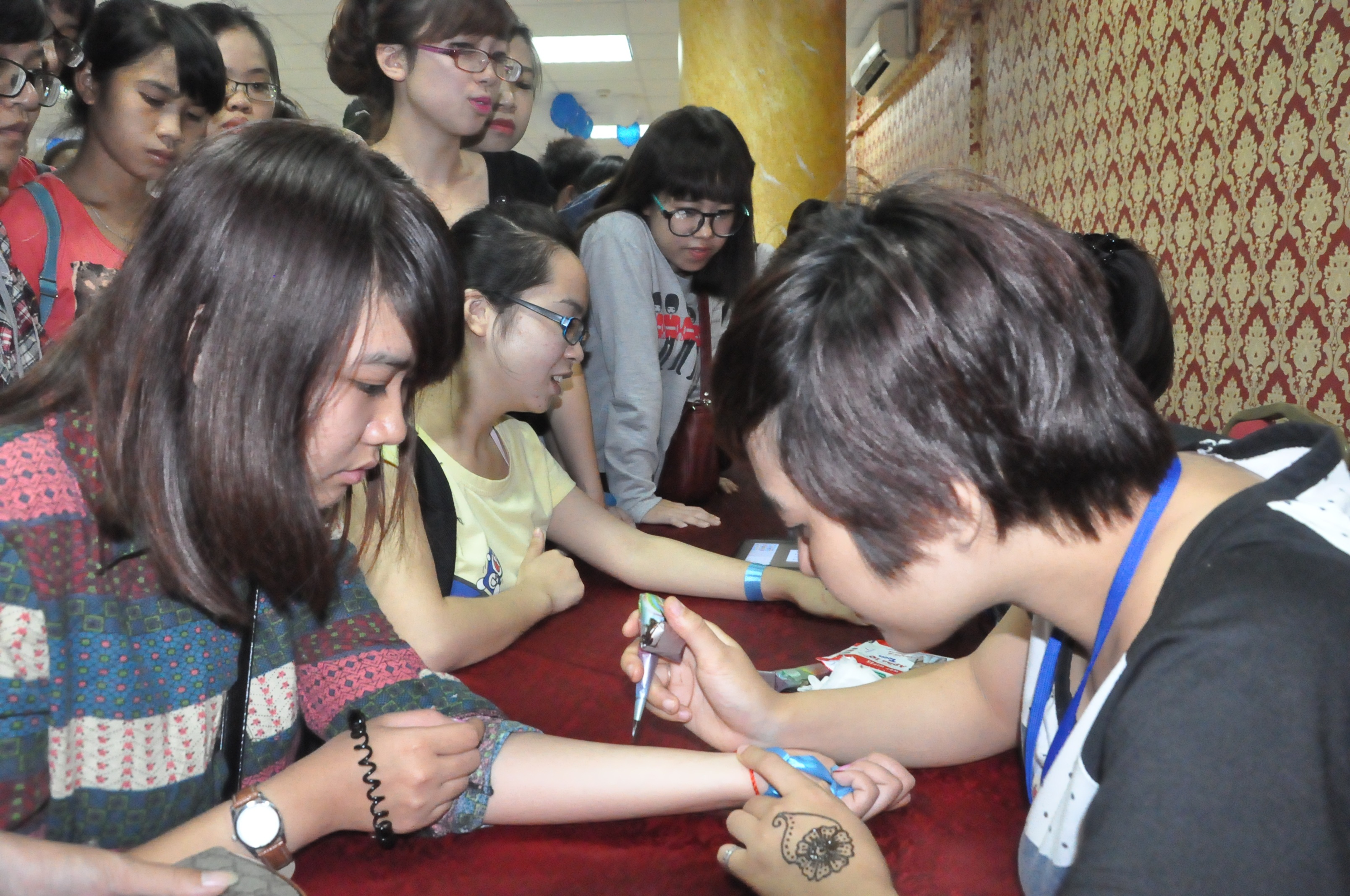 | Các hoạt động vẽ chibi, henna và hướng dẫn làm hoa giấy thu hút rất nhiều bạn trẻ. |