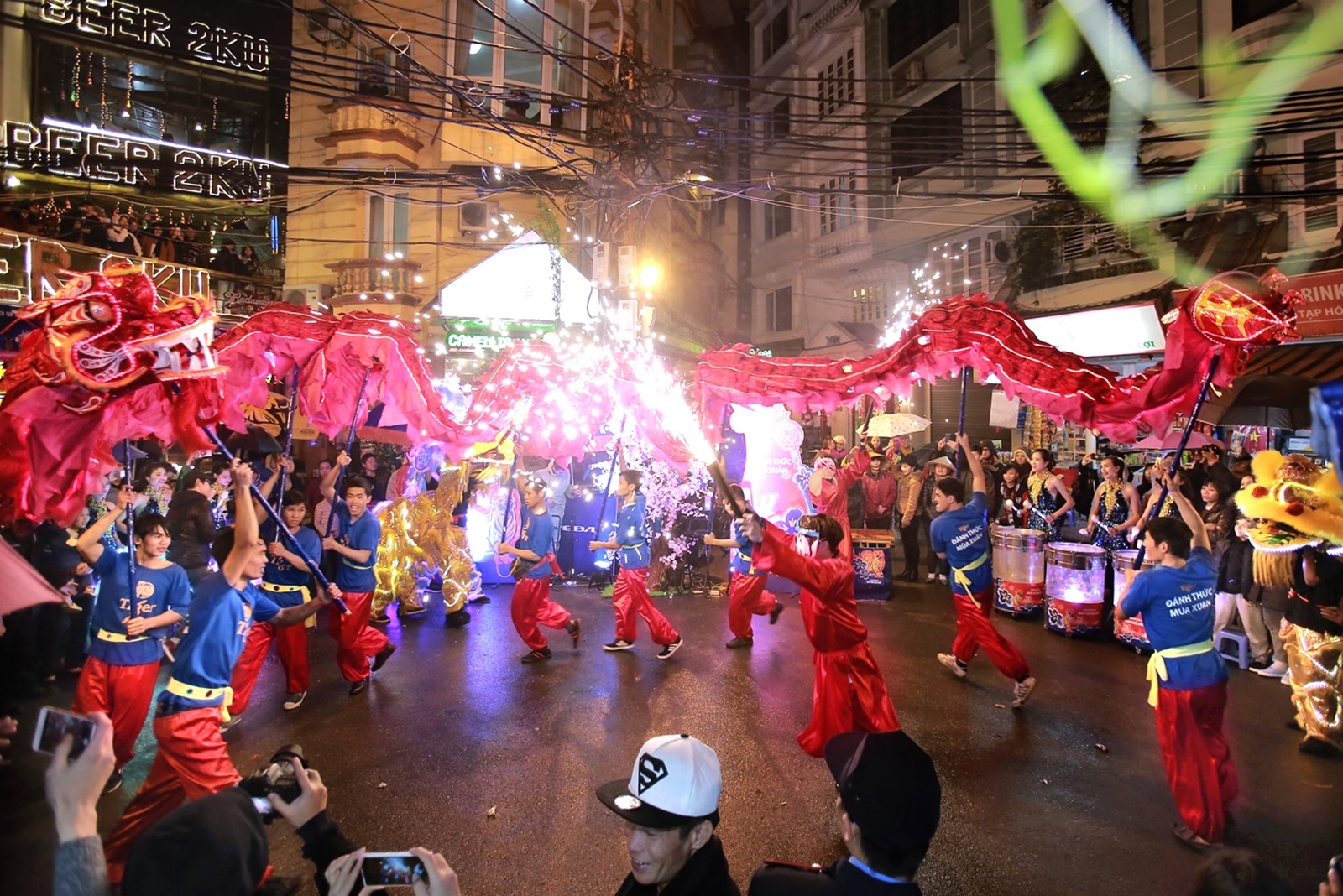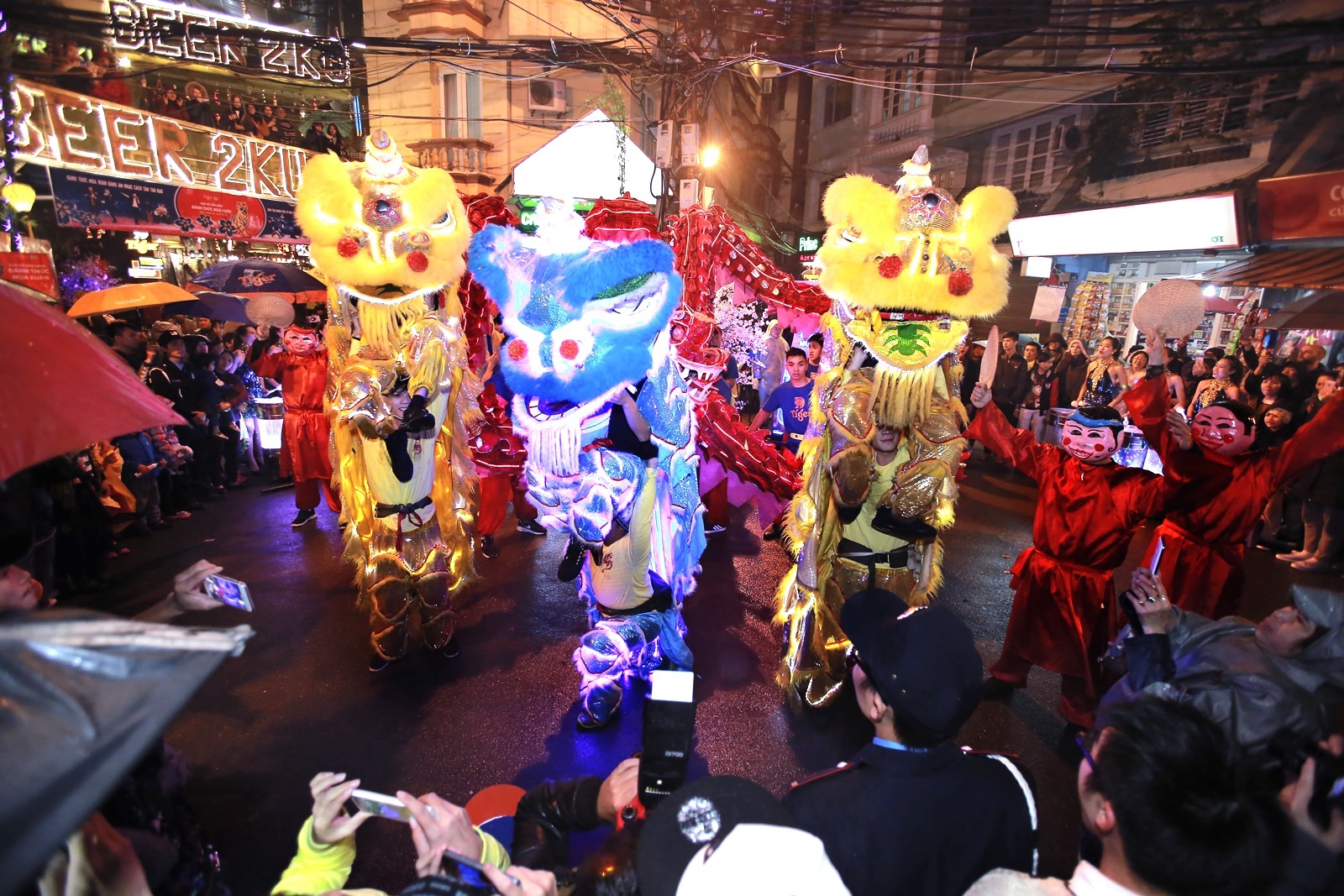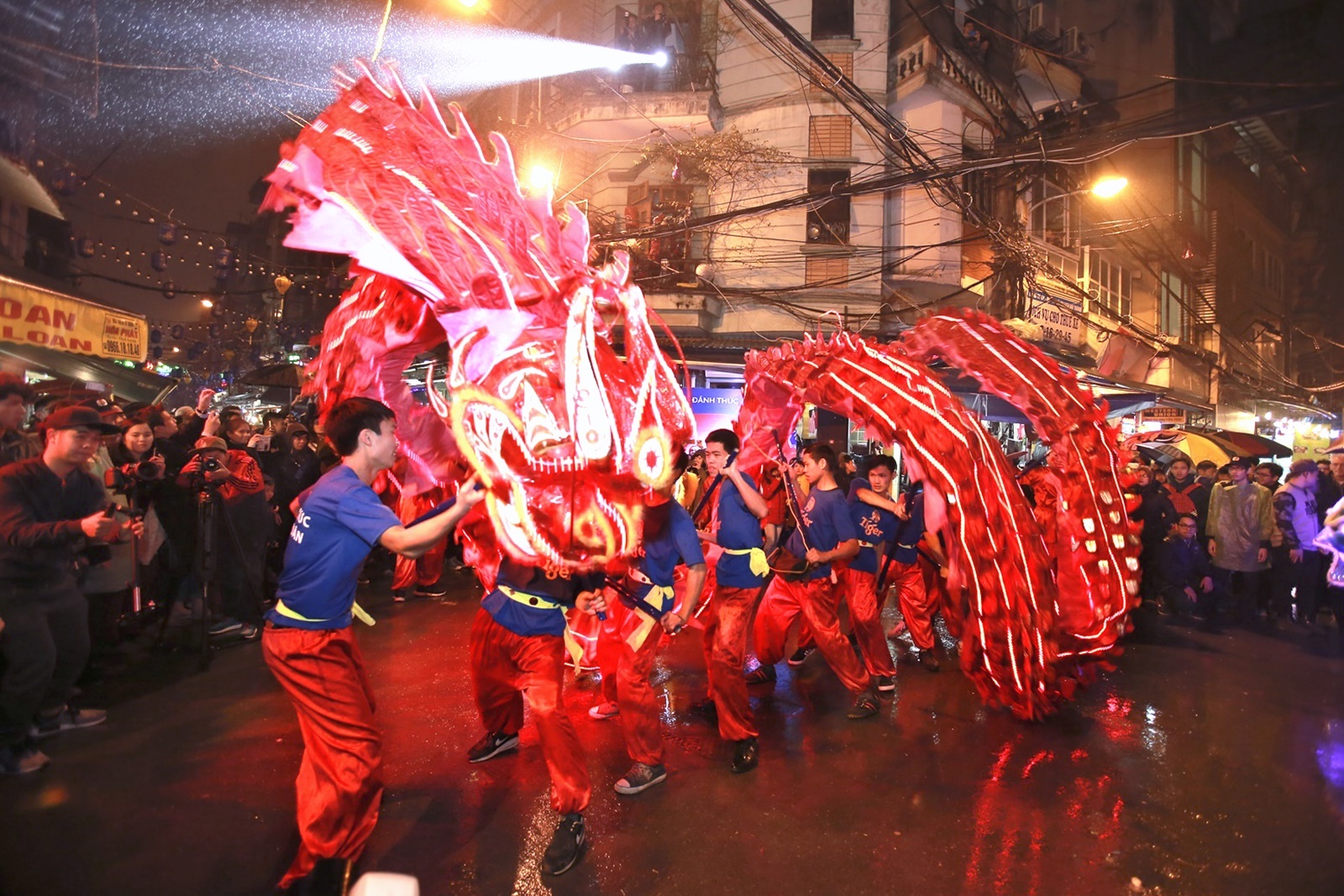 Điểm nhấn của chương trình là tiết mục múa lân rồng kết hợp nhạc EDM của đội lân Đông Đô. Hàng chục vũ công trẻ tuổi xuất hiện cùng pháo sáng khuấy động cả một góc phố. Các chú lân cách điệu được trang trí bằng hàng trăm bóng đèn LED, động tác múa linh hoạt theo giai điện tử sôi động. |