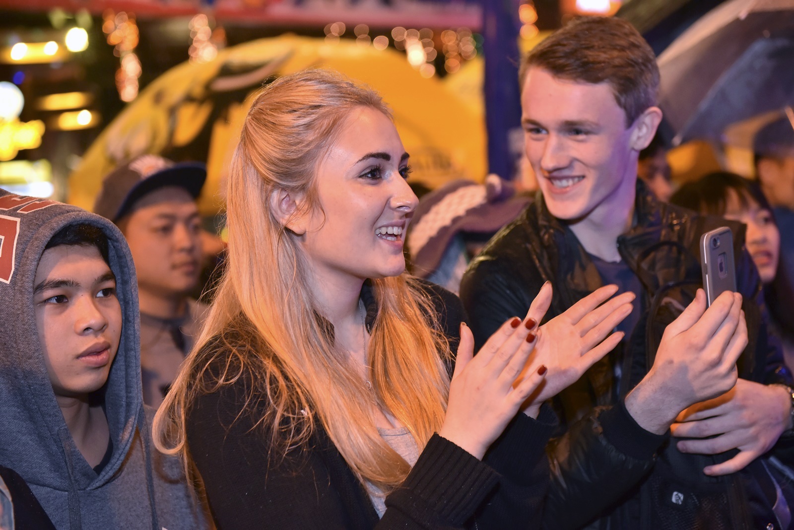 Một cặp đôi người nước ngoài thích thú thưởng thức các tiết mục. Yêu thích văn hóa truyền thống của Việt Nam, cả hai càng thêm phấn khích trước những màn cách tân táo bạo, góp phần mang nghệ thuật dân gian gần gũi hơn với khán giả. |