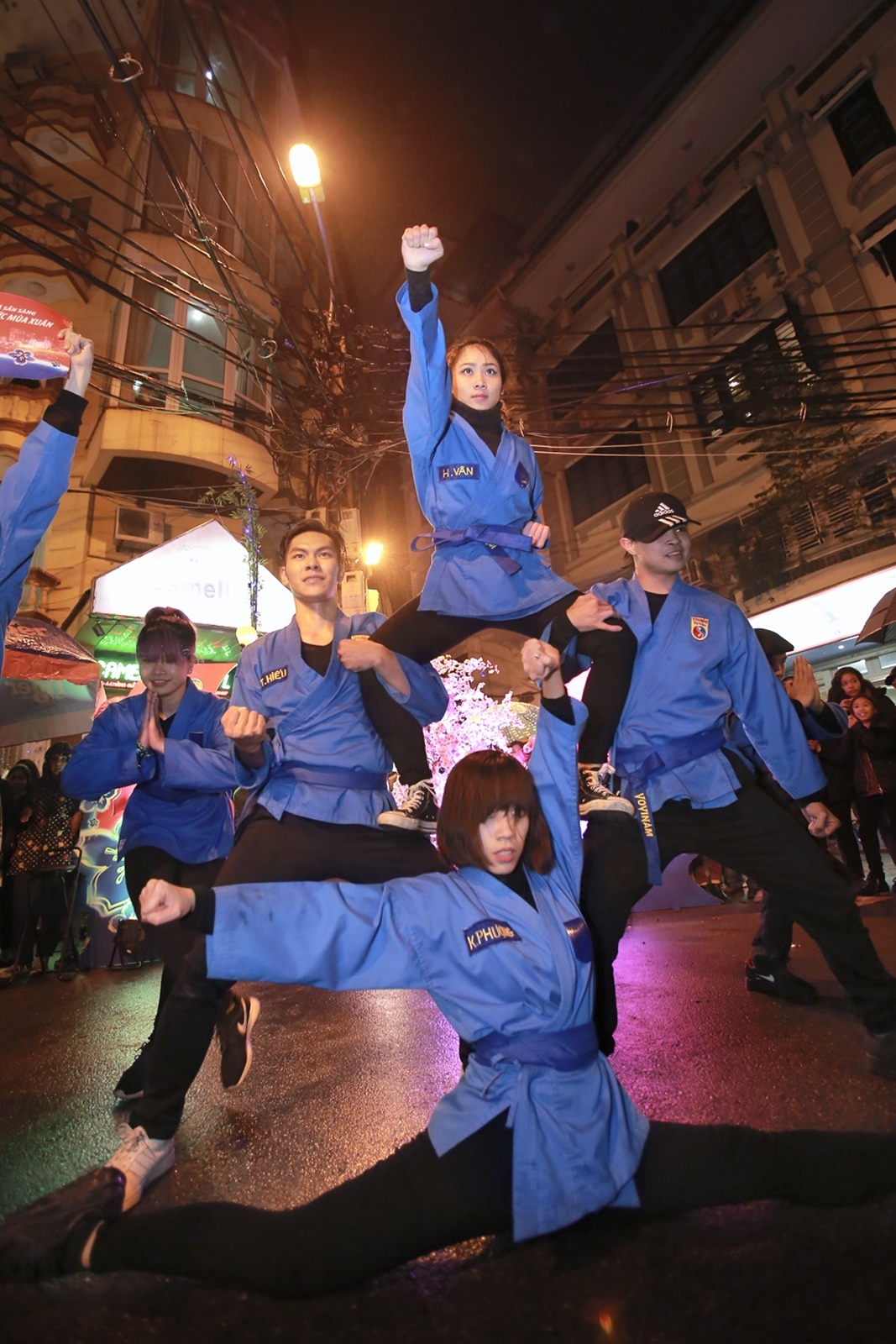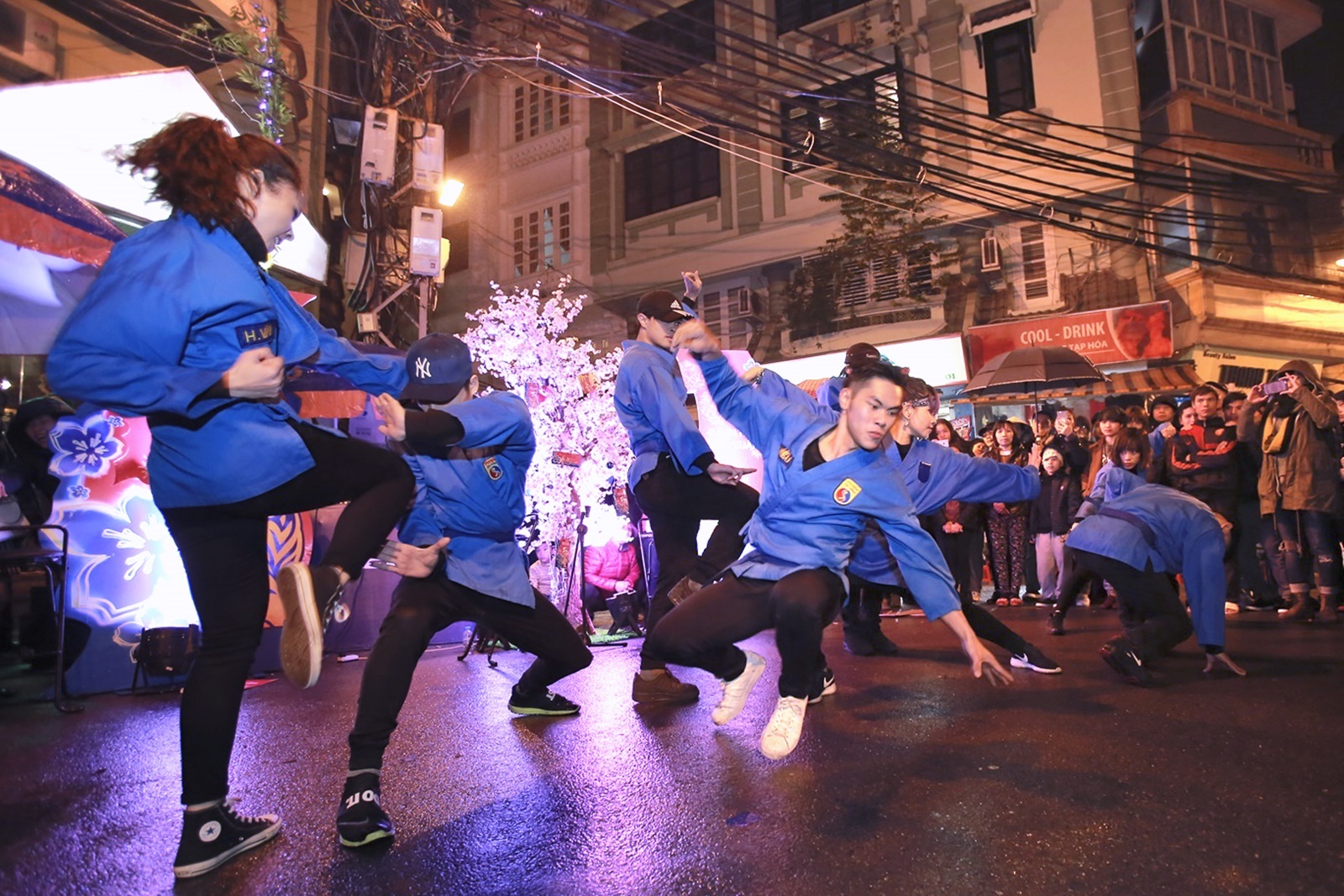 Điệu nhảy dân gian có từ lâu đời được khoác lên một thần thái mới, sôi nổi và hiện đại nhưng vẫn giữ được vẻ hào sảng, hùng hồn. Tiết mục tạo nên sức hút đặc biệt, khiến khu phố cổ đông lên trông thấy. |
