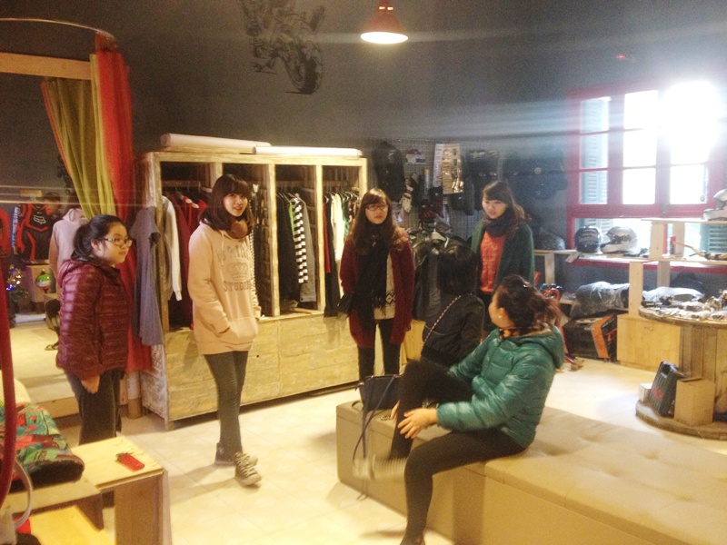 | Các cô gái tranh thủ mua sắm tại một cửa hàng thời trang. Tại đây, đa số cửa hàng đều bán đồ khá rẻ hoặc độc.