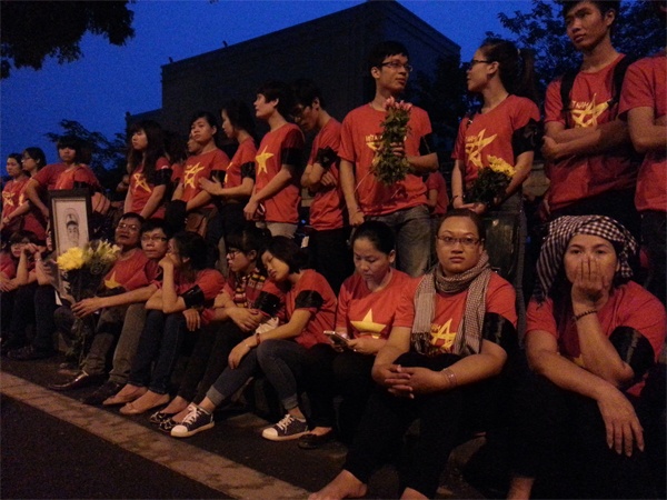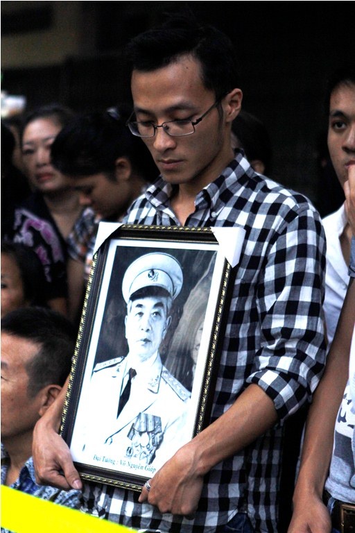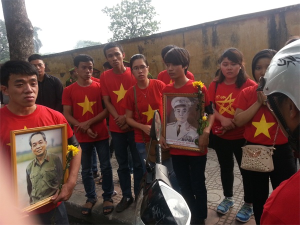 | Trong khi đó, trước nhà riêng Đại tướng hàng chục bạn trẻ mặc áo cờ đỏ sao vàng mang theo di ảnh Đại tướng. |