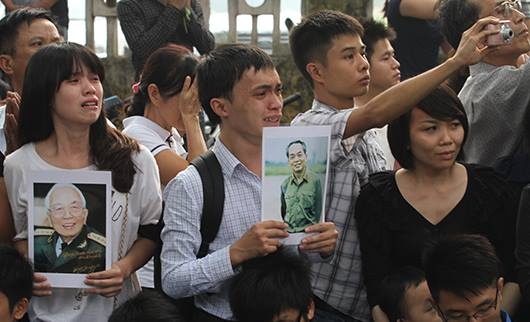 | Không ít người trẻ đã đeo băng tang, mang theo di ảnh Đại tướng trong sáng nay. |