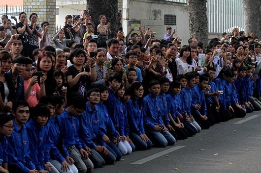 | Sinh viên tình nguyện quỳ gối bên lối di quan. |