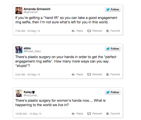 Lý giải cho việc phẫu thuật thẩm mỹ được đánh giá là không cần thiết này, bác sĩ da liễu tại New York (Mỹ) - Ariel Ostad cho biết: "Chính các phương tiện truyền thông ngày nay khiến mọi người quan tâm nhiều hơn đến sự xuất hiện và cách thể hiện bản thân. Do đó, nếu như phụ nữ biết được rằng có cách nhanh chóng giúp họ đẹp hơn (dù chỉ là ở ngón tay), nhất là trong ngày trọng đại nhất đời mình thì họ sẽ sẵn sàng thực hiện".