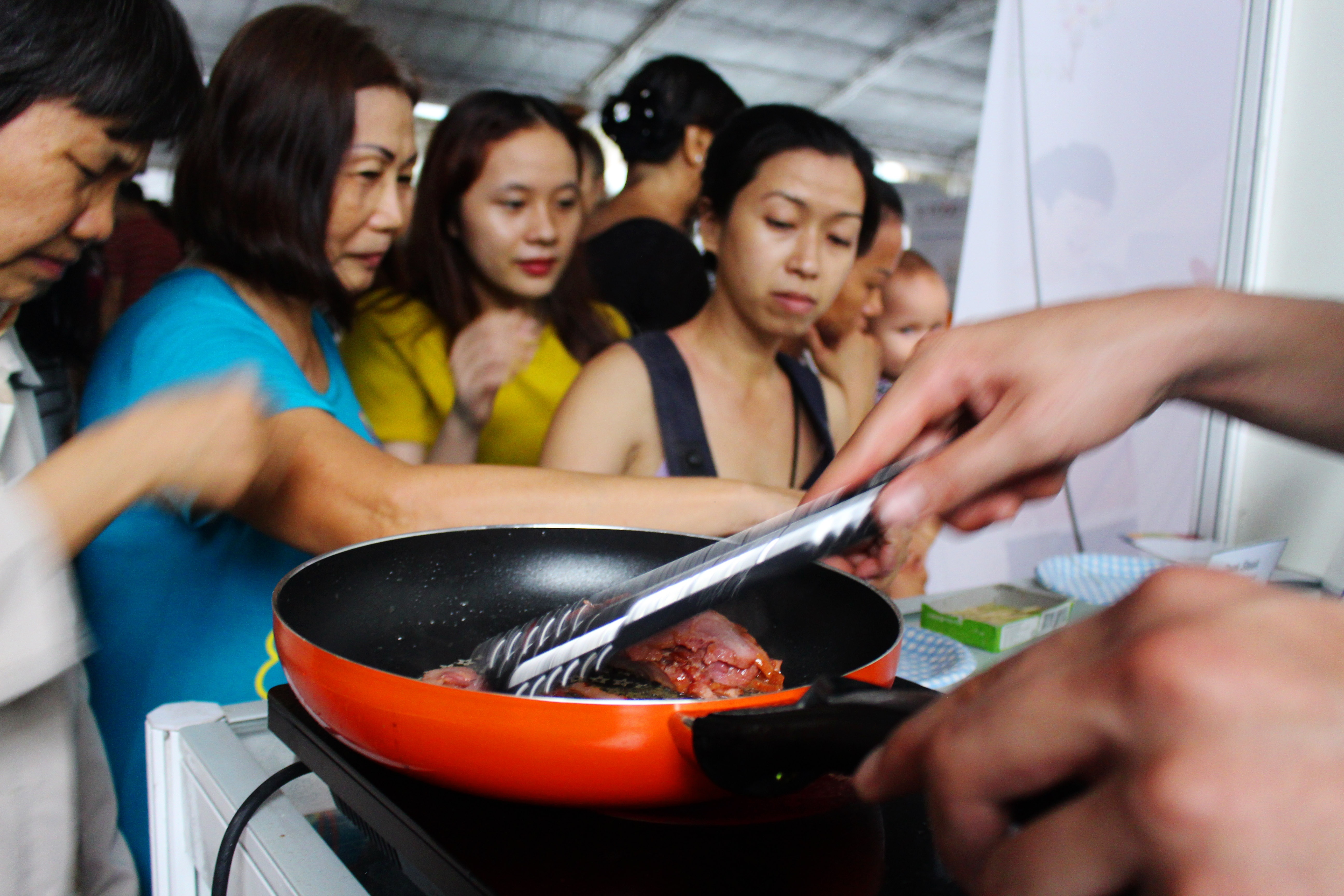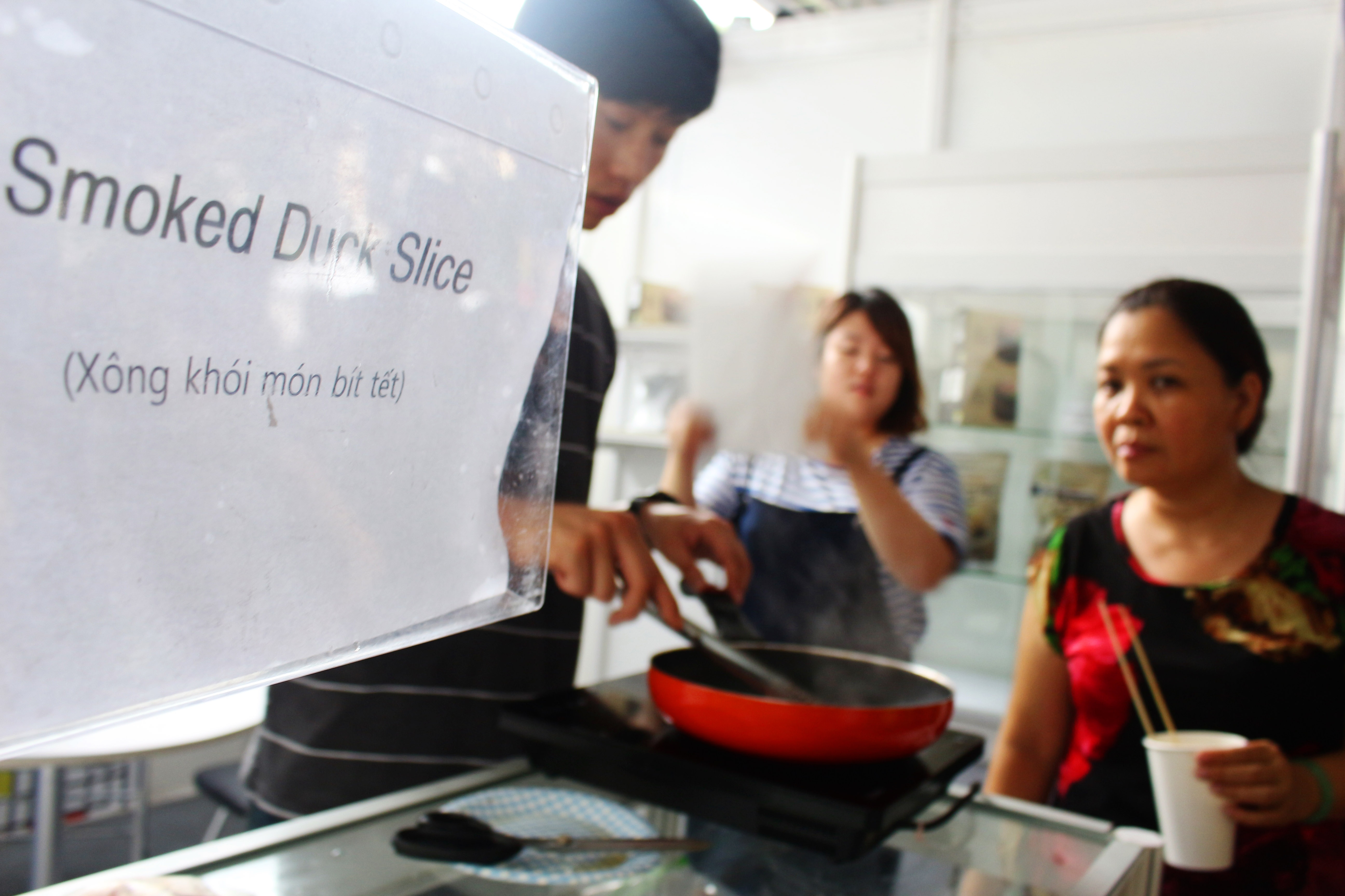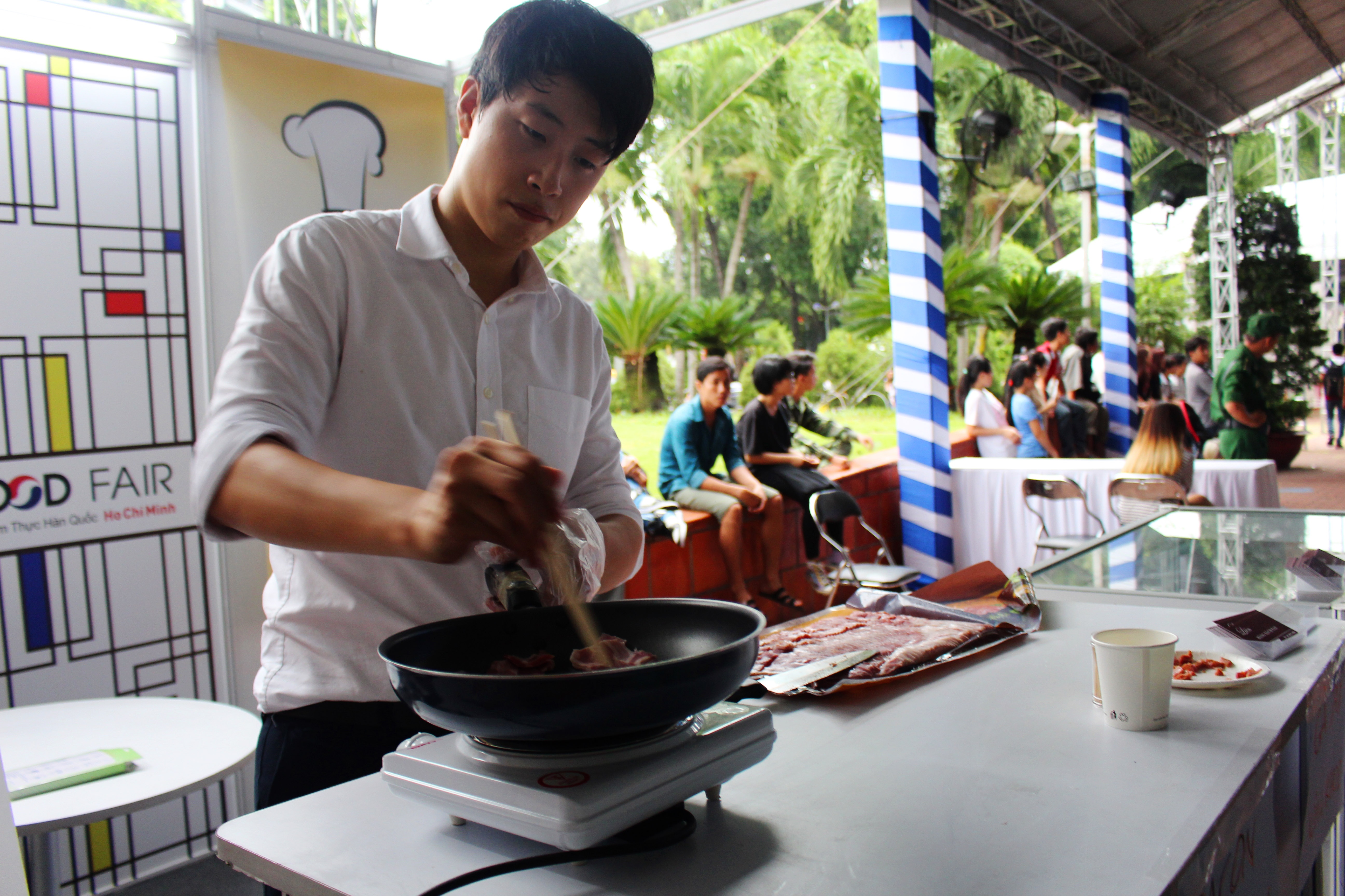 Nhân viên người Hàn Quốc của gian hàng thịt ba chỉ xông khói cho biết từ sáng đến giờ anh đã phục vụ khách tham quan gói thịt thứ 8 (mỗi gói 1 kg). Món ăn của gian hàng này cũng mời khách dùng thử, không bán.
