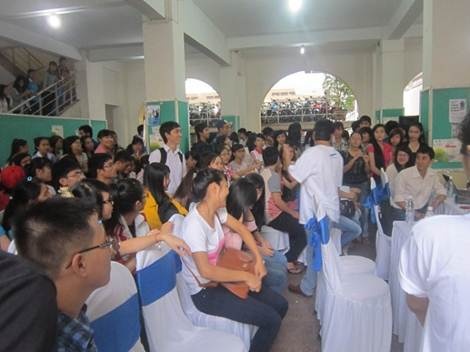 | Các sinh viên thích thú đến với bàn trải nghiệm của sự kiện. |