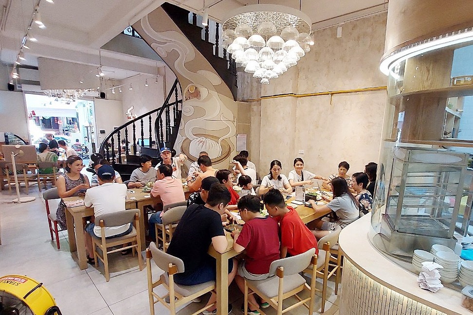 “Chỉ trong sáng nay đã có hơn 20 người book bàn. Khách vãng lai ngồi kín 3 không gian từ ngoài trời đến tầng trệt. Đa số khách đến đây thích gọi hủ tiếu, sủi cảo, hoành thánh và một số món Á - Âu khác”, anh Trung chia sẻ.