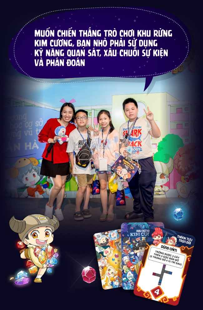 Để “ươm mầm hạt giống kim cương”, các bạn nhỏ có thể lựa chọn thẻ nhiệm vụ hàng ngày - dễ chơi, ít điểm hoặc thẻ nhiệm vụ trọn đời - khó thắng, điểm cao. Điều này giống như trong cuộc sống, chúng ta có thể kiên trì theo đuổi một mục tiêu lớn, hay chọn hoàn thành những nhiệm vụ nhỏ để “tích tiểu thành đại” và đạt được thành tựu mong muốn. Cách nào cũng sẽ đến đích nhưng quan trọng là mỗi bạn nhỏ cảm thấy hạnh phúc khi được tự mình đưa ra quyết định.