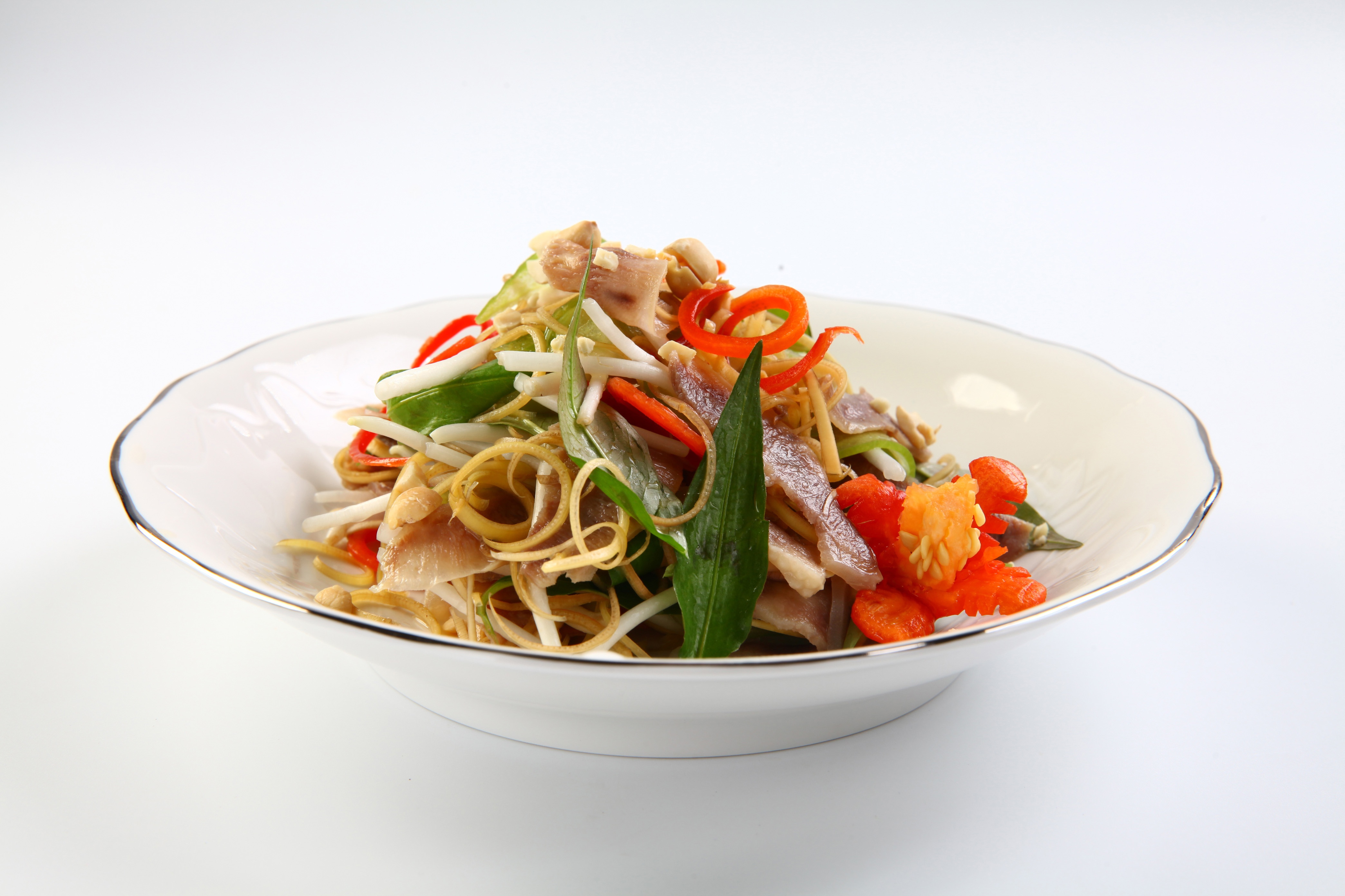 Khi ăn, cho hoa chuối, tai heo, giá, rau răm vào tô. Đổ hỗn hợp trộn gỏi vào, trộn đều. Cho đậu phộng lên trên.
