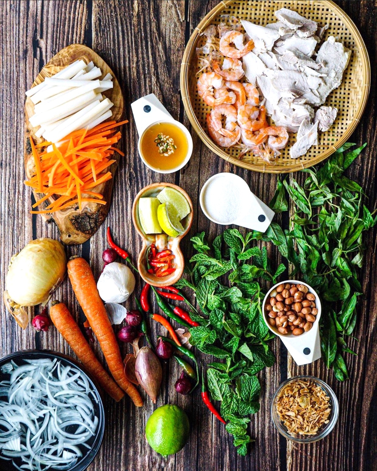 | Đặc biệt, gỏi ngó sen tai heo được nhiều người ưa chuộng hơn cả. Ngó sen tươi được rửa sạch rồi chẻ thành từng tép nhỏ. Tai, mũi, bì heo được luộc chín và thái mỏng. Các loại rau củ trộn cùng gồm cà rốt, cà tím, dưa chuột, củ đậu, rau thơm... Khi thưởng thức, bạn rưới nước mắm chua ngọt và trộn đều các nguyên liệu trên, sau đó rắc thêm đậu phộng để cảm nhận trọn vẹn vị thanh mát. Ảnh: _TheFoodCouple_. |