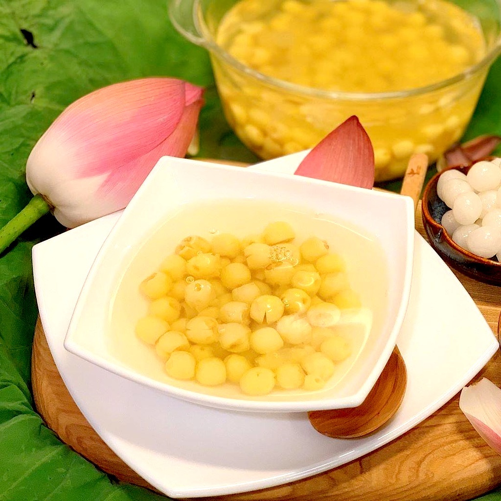 | Chè hạt sen là món giải nhiệt lý tưởng trong ngày hè. Hạt sen được rửa sạch và bỏ tim sen, rồi luộc hoặc hấp đến khi hạt chín mềm. Sau khi nấu chảy đường phèn, bạn thả hạt sen vào đun nhỏ lửa khoảng 10 phút để sen thấm vị ngọt. Ảnh: Hoabachhop0109. |