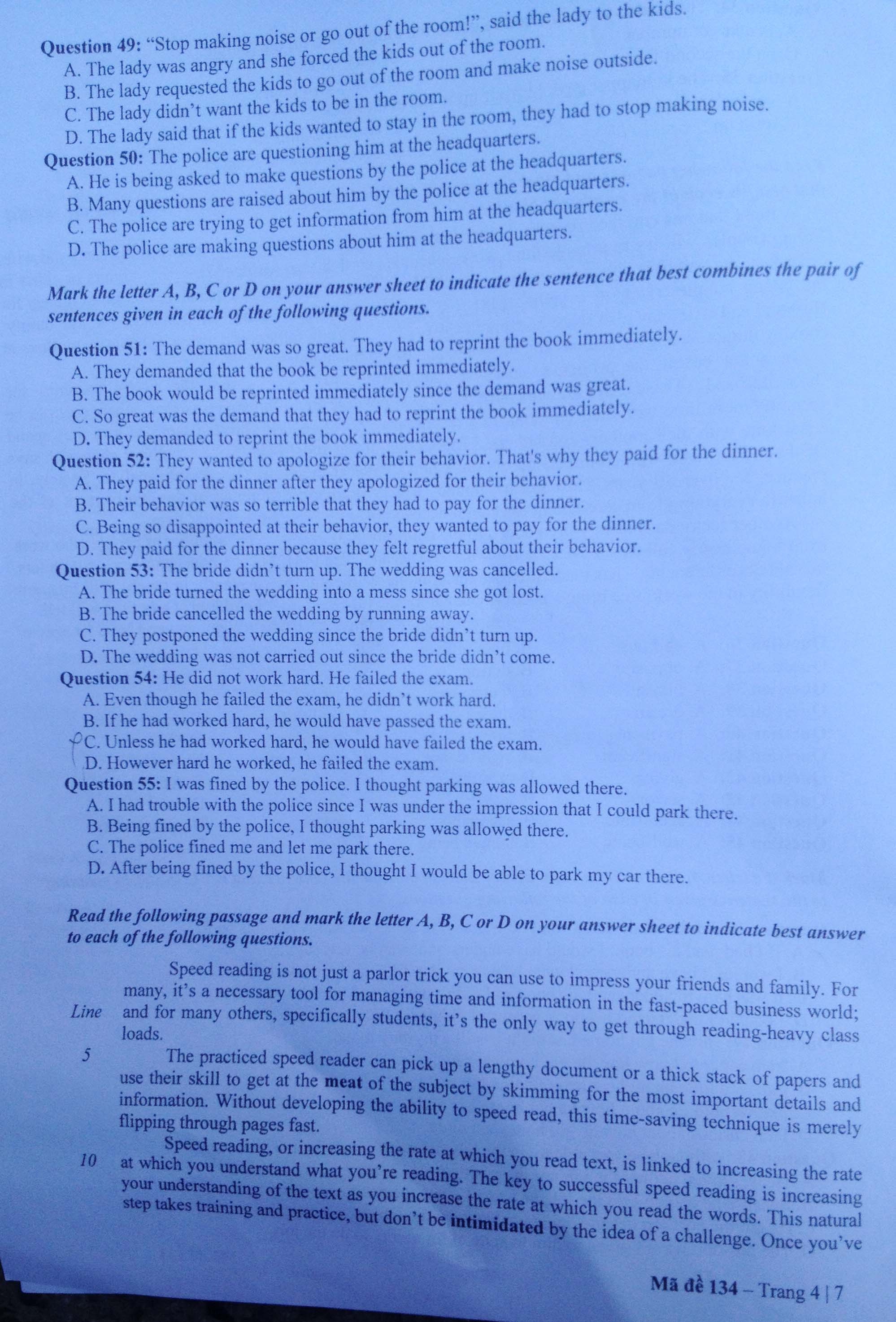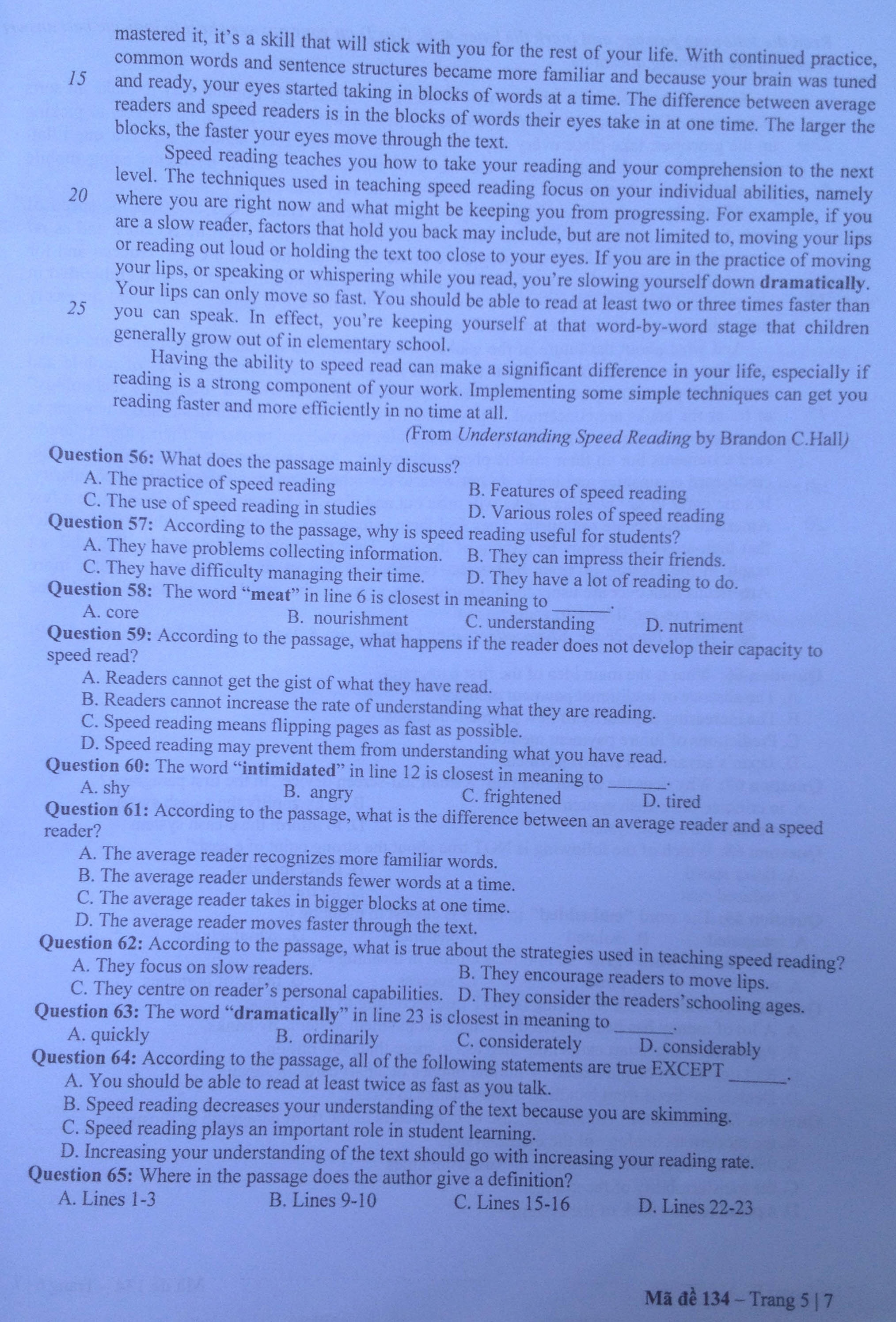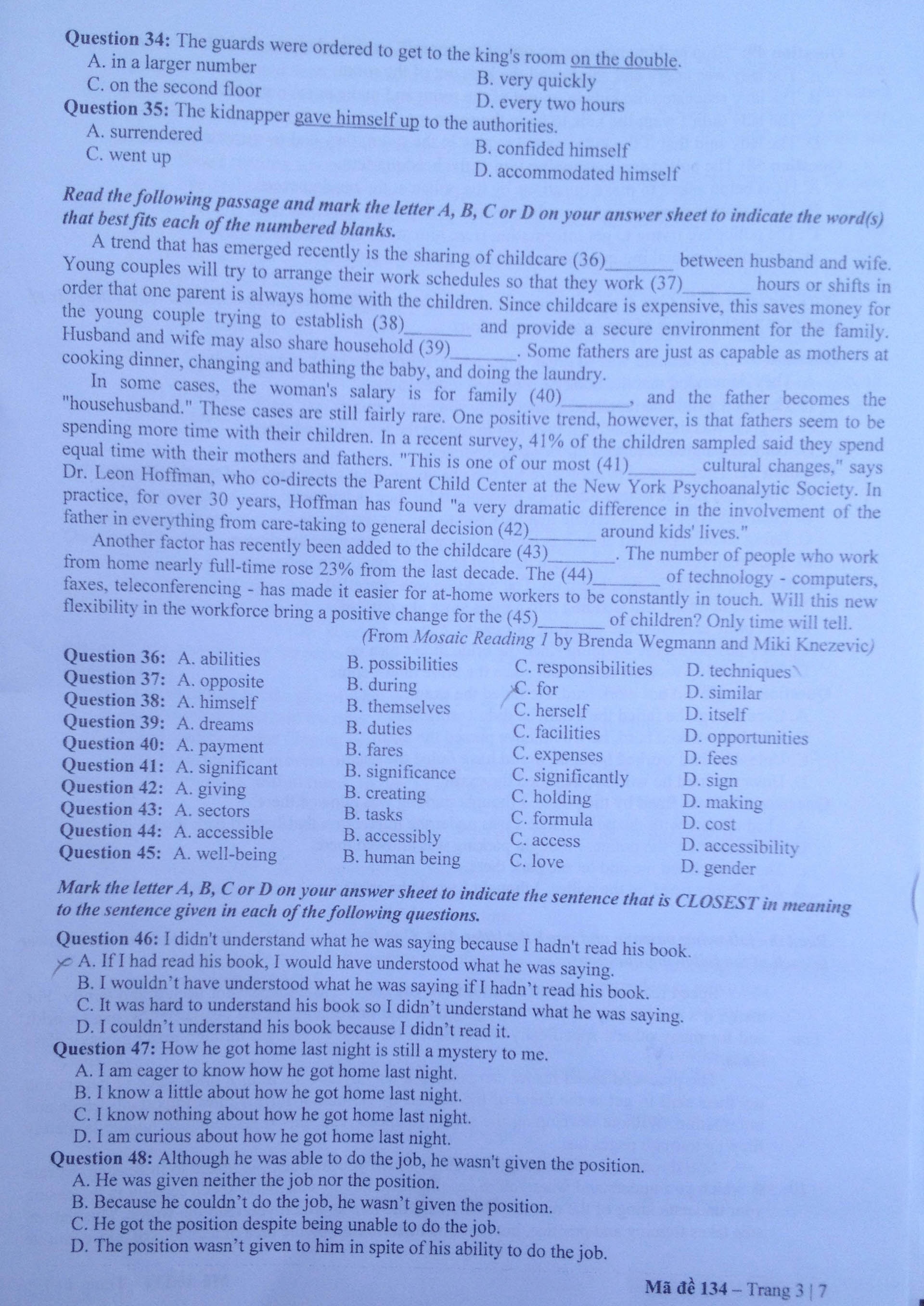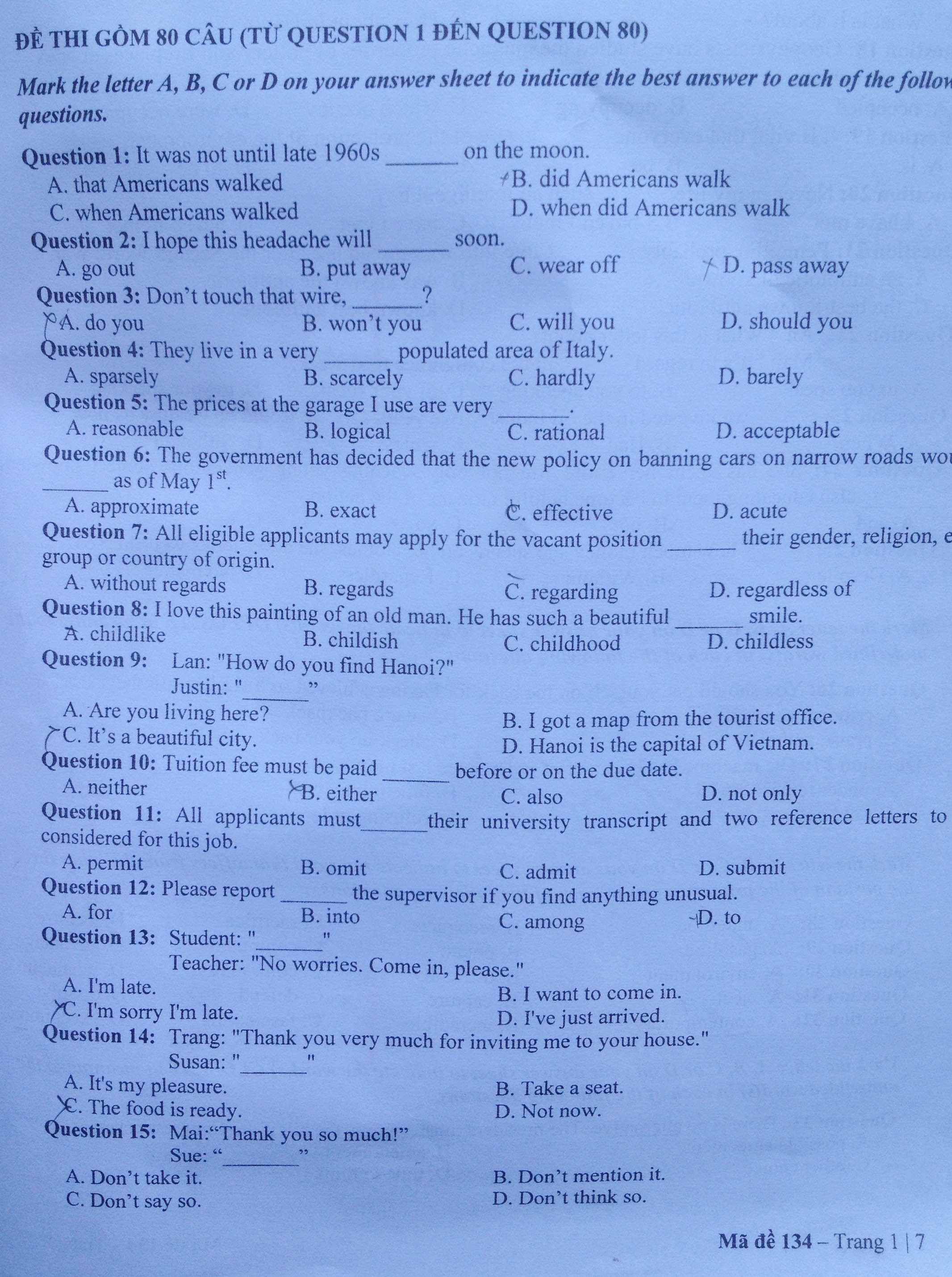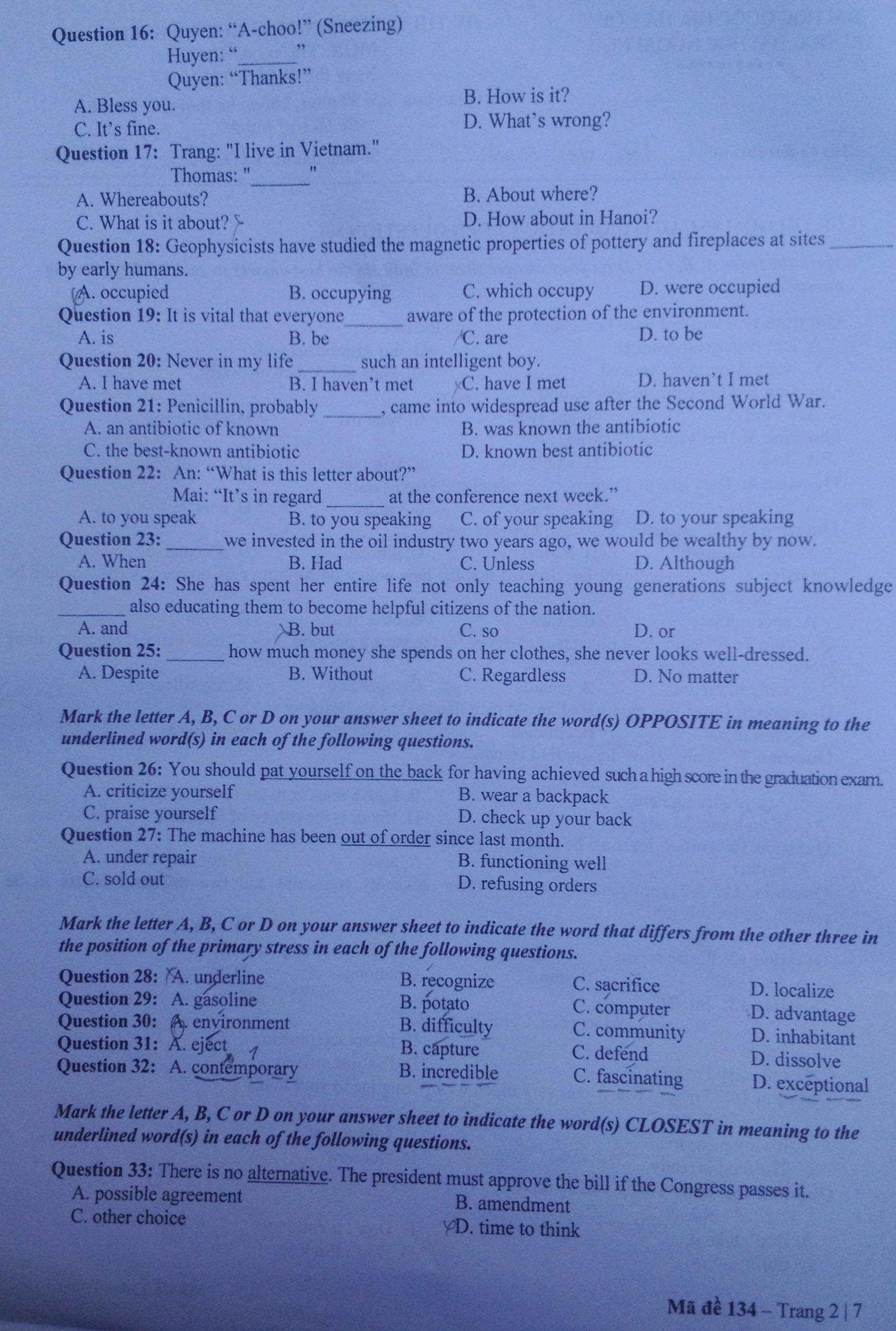 Đề thi trắc nghiệm môn Tiếng Anh (mã đề 134)