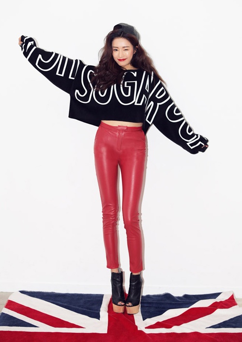 | Áo len lửng trở nên kín đáo khi cắm thùng cùng chân váy cạp cao dáng xòe. |