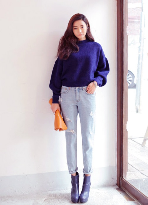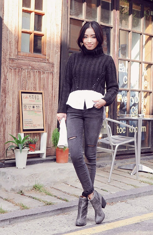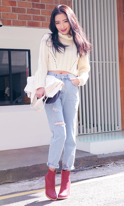 Phong cách nghịch ngợm với quần boyfriend xé , boot và áo len lửng cao cổ.