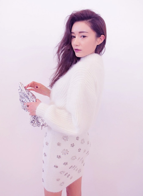 Hóa thân thành công chúa tuyết với cả cây trắng của áo len lửng và chân váy len.