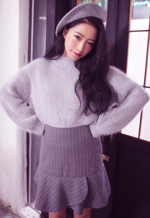 Tông xám trở nên không hề đơn điệu với cách mix cùng chân váy cách điệu và áo len lửng.