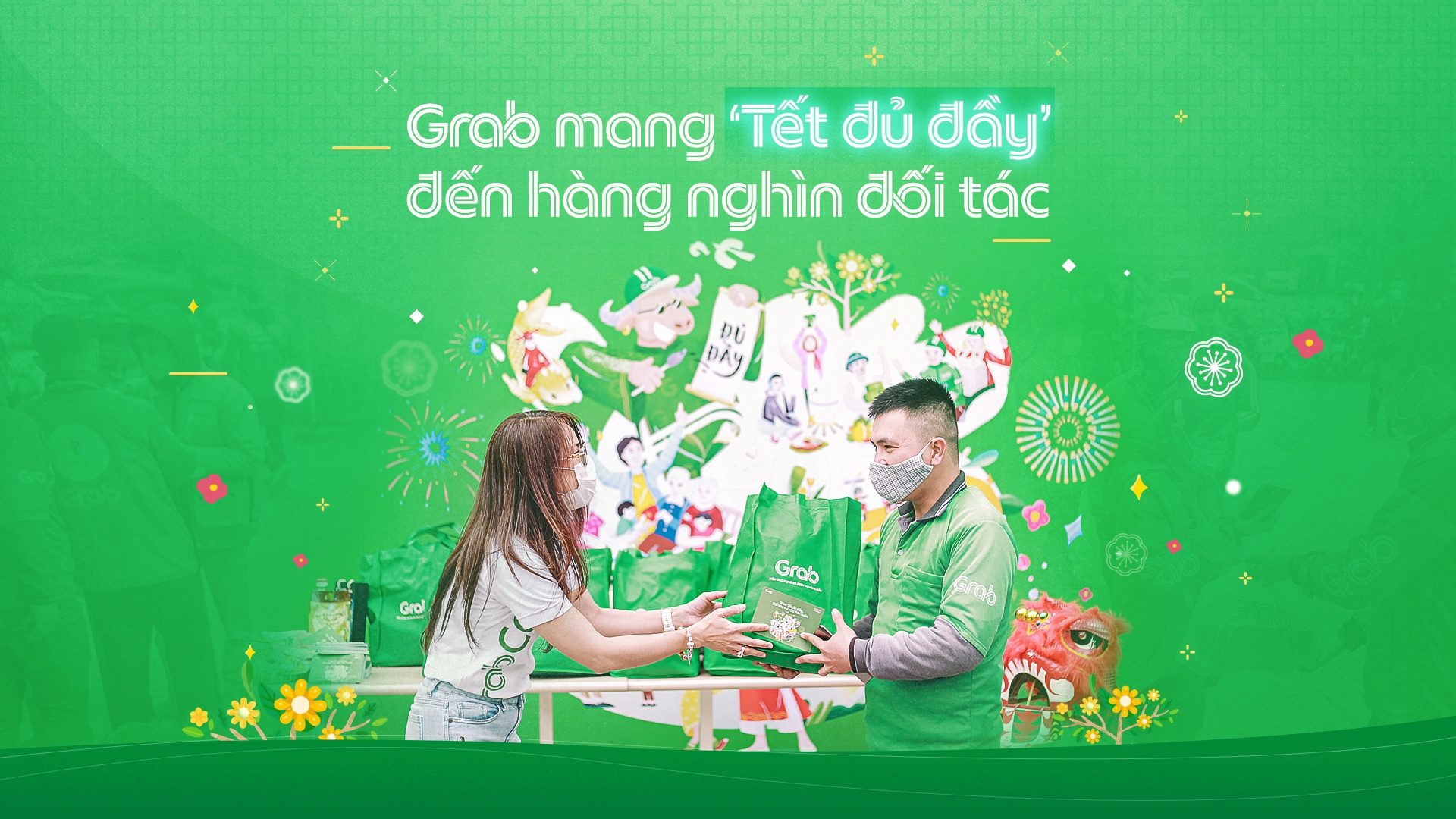 "Cùng Grab chung tay, trao Tết đủ đầy"Từ ngày 25/1, chương trình "Cùng Grab chung tay, trao Tết đủ đầy" đã bắt đầu diễn ra tại Hà Nội và TPHCM. Chương trình đã và đang trao quà cho hàng nghìn đối tác lâu năm và có hoạt động tích cực trong suốt năm 2020. |