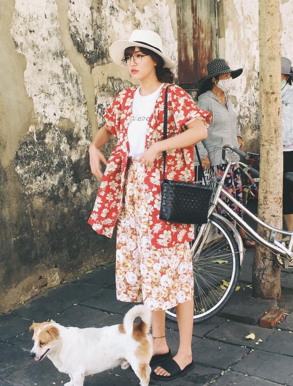| Họa tiết hoa được giọng ca trưởng thành từ Vietnam Idol ứng dụng trong chuyến du lịch đến Hội An. Trên đường phố đậm chất hoài cổ, nữ ca sĩ nổi bật với trang phục hơi hướng Nhật Bản. |