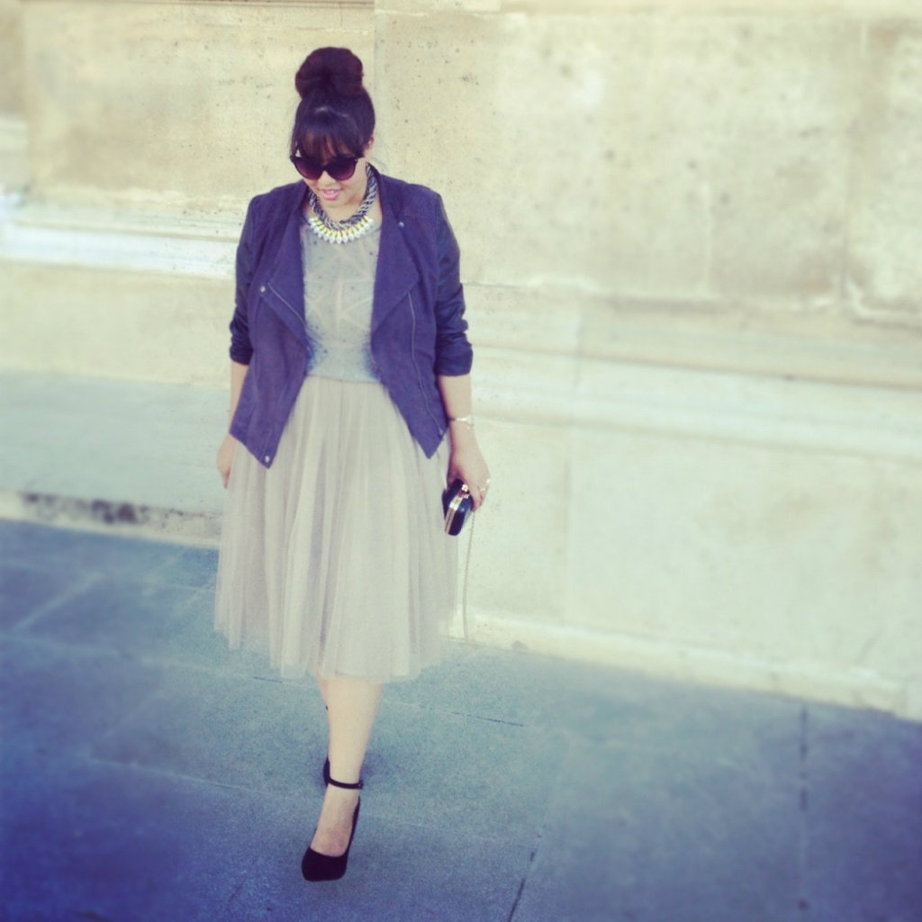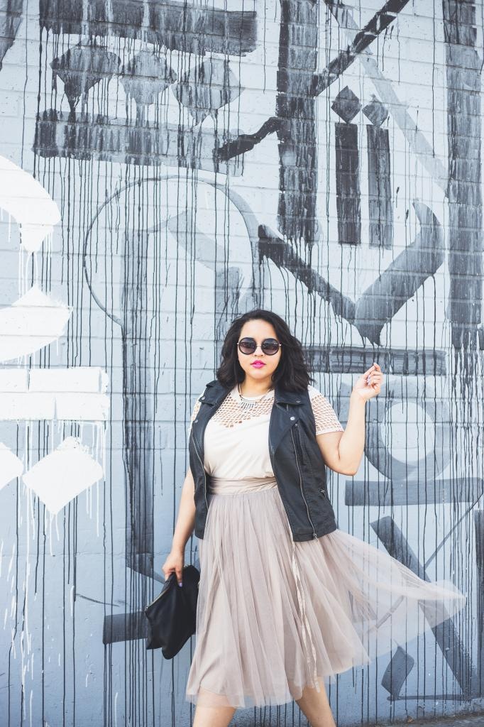 Cách kết hợp phá cách của váy trong suốt với áo gillet da tạo nên điểm ấn tượng cho cô gái da màu.