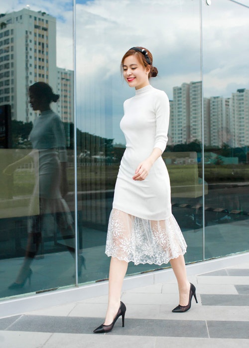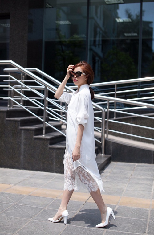 | Kiểu váy sơ mi ren hết sức duyên dáng được cô lựa chọn. Ảnh: Tiên Nguyễn, Minh Luân |