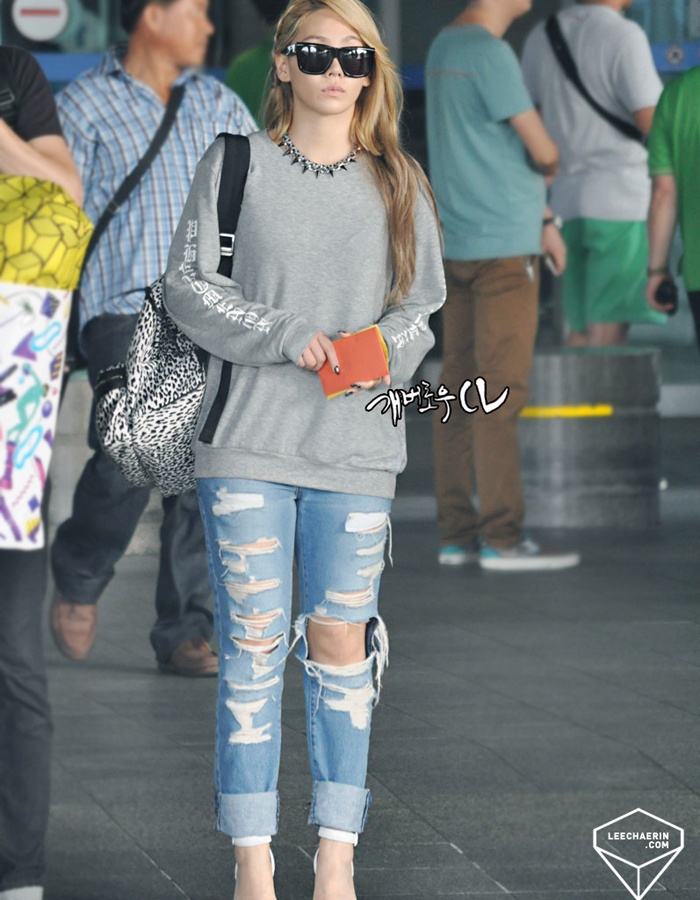 | Quần jean rách bụi bặm kết hợp ăn ý cùng giày cao gót trắng yểu điệu là một trong những công thức "phá cách" CL thường áp dụng. |