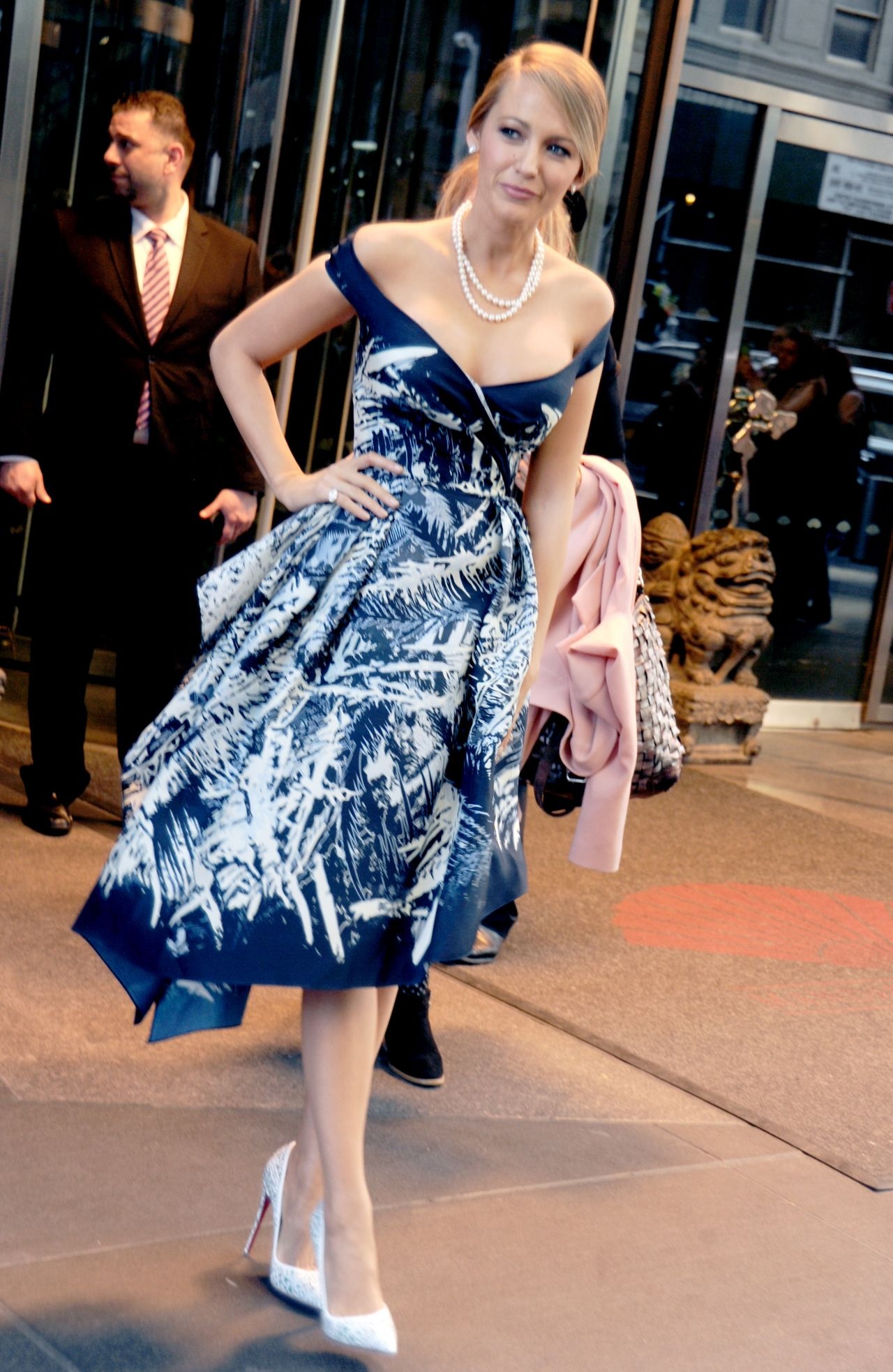 | Đầm hoa văn với các đường xếp thoạt trông rối mắt nhưng khi gắn lên người Blake lại tạo những đường cong đẹp mắt. |