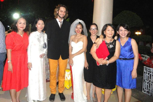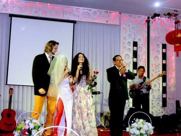 | Mai Khôi làm cô dâu cá tính trong ngày cưới với gu thời trang độc lạ, chú rể Ben chọn chiếc quần màu vàng nổi bật không kém. Bộ đôi trở thành cô dâu, chú rể nổi bật nhất làng giải trí bởi cách chọn trang phục lạ mắt. |