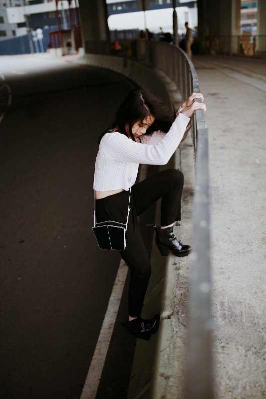 Điểm nhấn đi kèm cùng trang phục của cô nàng là chiếc túi xách lạ mắt cùng đôi boots hầm hố.