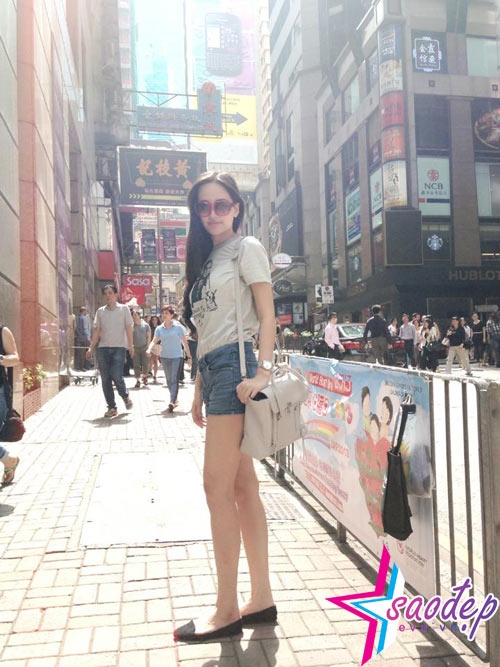 Cô cũng kết hợp rất nhuần nhuyễn áo số và mốt không quần khi diện kèm giầy độn.