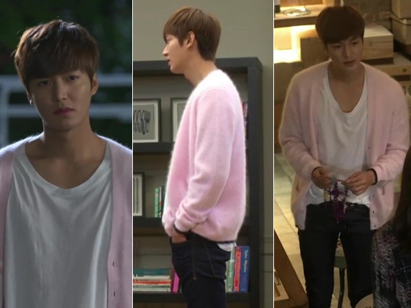 | Chọn được gam màu sáng với cách phối đơn giản nhưng Lee Min Ho mất điểm vì chiếc áo cardigan len lông xù phù hợp hơn với phái nữ. |