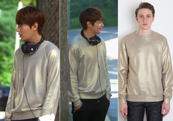 | Hay áo sweatshirt chất liệu ánh kim loại đã cộng thêm vài kg cho cậu “học sinh” Lee Min Ho. |